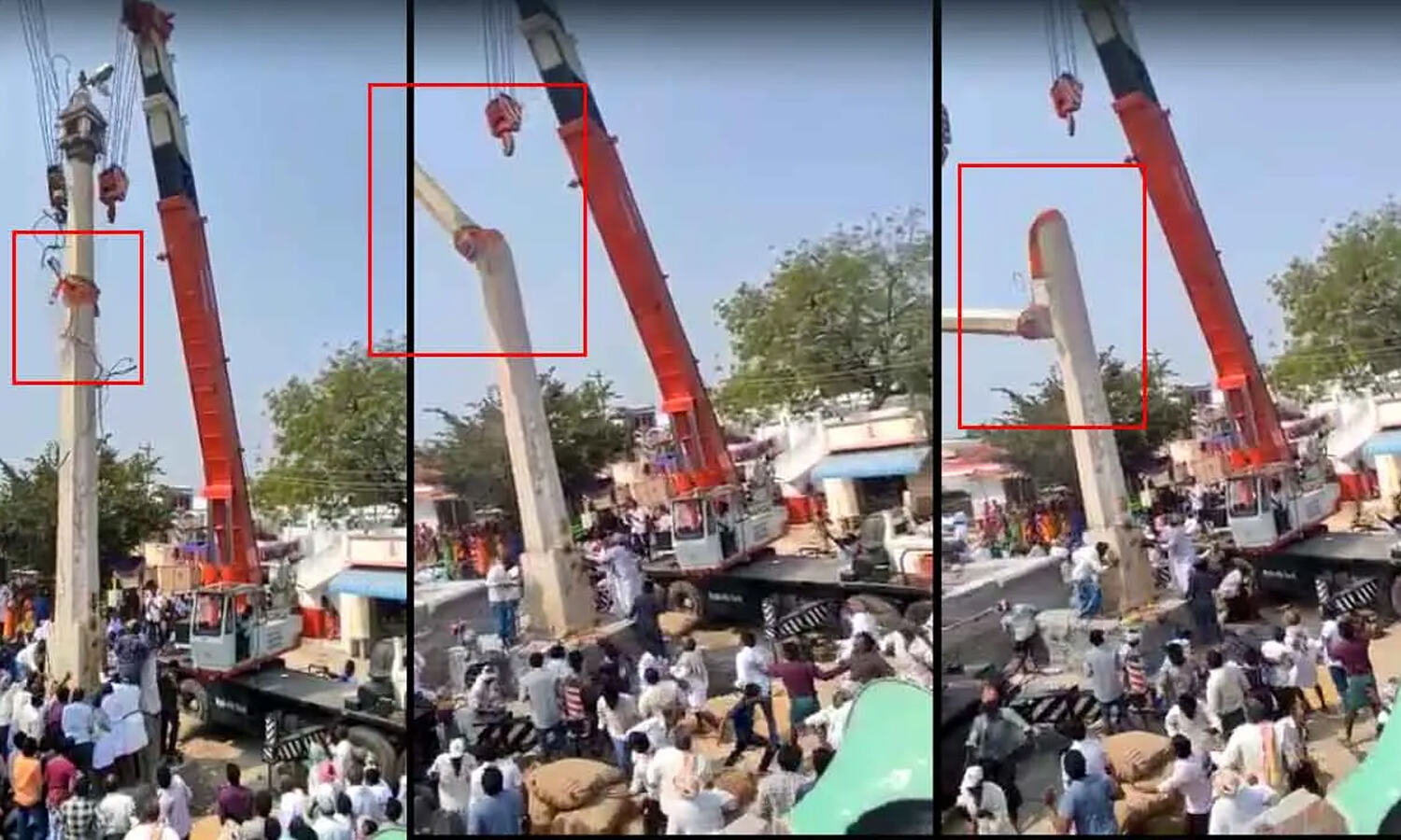 వెంటనే ప్రమాదాన్ని గ్రహించి తప్పుకోవడంతో.. పెద్ద ప్రమాదమే తప్పింది. ధ్వజస్తంభానికి ఇరువైపులా తాడులు కట్టి.. రెండు క్రేన్ల సహాయంతో దానిని ఆలయం ఎదుట పునః ప్రతిష్టిస్తుండగా.. ఒక్కసారి రెండు క్రేన్లకు జోడించిన తాడులు తెగిపోయాయి. ధ్వజస్తంభం అమాంతం కిందపడిపోయింది. భక్తులు అప్రమత్తమై పరుగులు తీయడంతో ఎలాంటి ప్రాణ నష్టం జరగలేదని తెలుస్తోంది. స్థానికులు ఈ వీడియోను సోషల్ మీడియాలో పోస్ట్ చేయగా.. అది వైరల్ అవుతోంది.