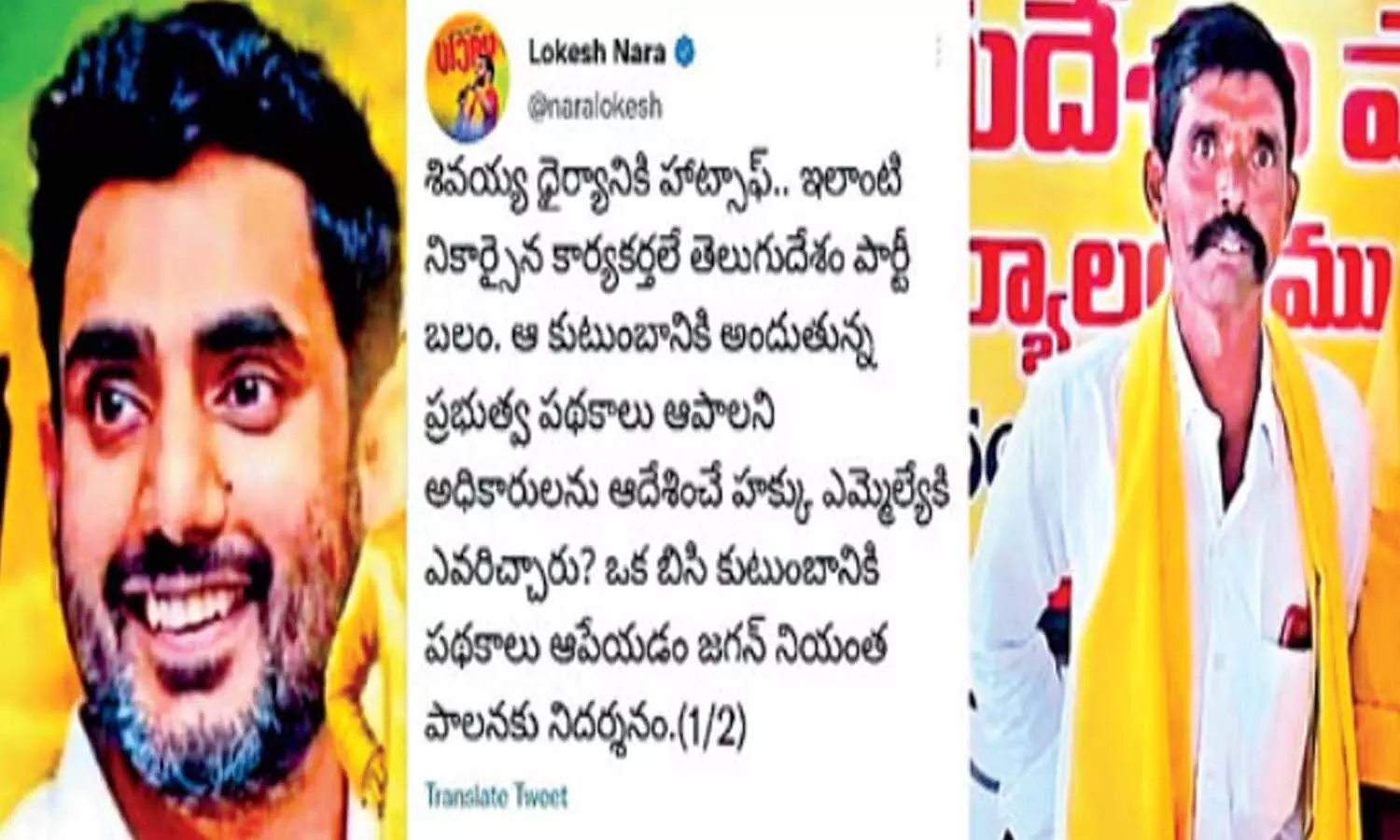 అలాంటి నిఖార్సయిన కార్యకర్తలే పార్టీకి కావాలని తెలుగుదేశం పార్టీ జాతీయ ప్రధాన కార్యదర్శి నారా లోకేష్ అన్నారు. అనంతపురం జిల్లా ధర్మవరం నియోజకవర్గంలో శివయ్య అనే టీడీపీ కార్యకర్త తమకు ప్రభుత్వ పథకాలు అక్కరలేదని ఎమ్మెల్యే కేతిరెడ్డి మొఖంపైనే చెప్పటాన్ని ఆయన ప్రశంసించారు. ఇలాంటి కార్యకర్తలే పార్టీకి బలమని లోకేష్ అభిప్రాయపడ్డారు. ఎమ్మెల్యే కేతిరెడ్డి ఇచ్చిన పత్రాన్ని తీసుకునేందుకు కూడా నిరాకరించాడు. తన ఇంటిమీద ధైర్యంగా తెలుగుదేశం జెండాను కట్టాడు.