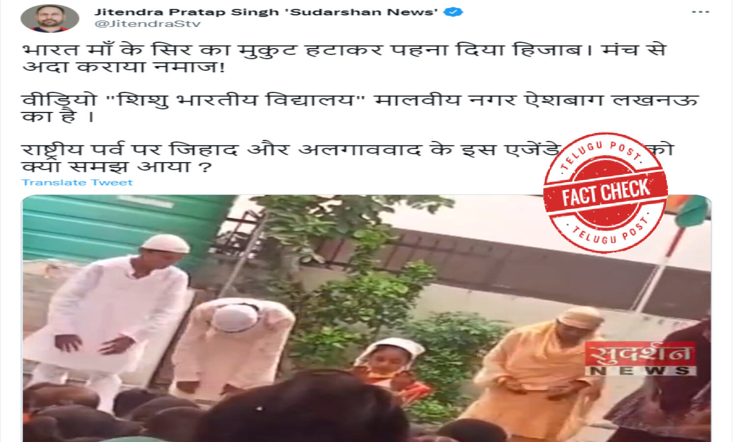 This video is shared with a claim in Hindi "भारत माँ के सिर का मुकुट हटाकर पहना दिया हिजाब। मंच से अदा कराया नमाज! वीडियो "शिशु भारतीय विद्यालय" मालवीय नगर ऐशबाग लखनऊ का है । राष्ट्रीय पर्व पर जिहाद और अलगाववाद के इस एजेंडे से आपको क्या समझ आया ?"