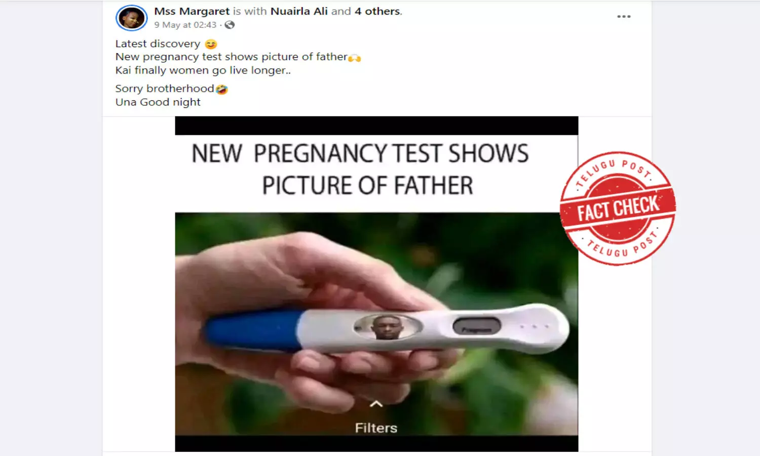 An image of a pregnancy test kit showing the face of a person is shared virally with the claim that it can reveal the father’s identity along with confirming the pregnancy.
