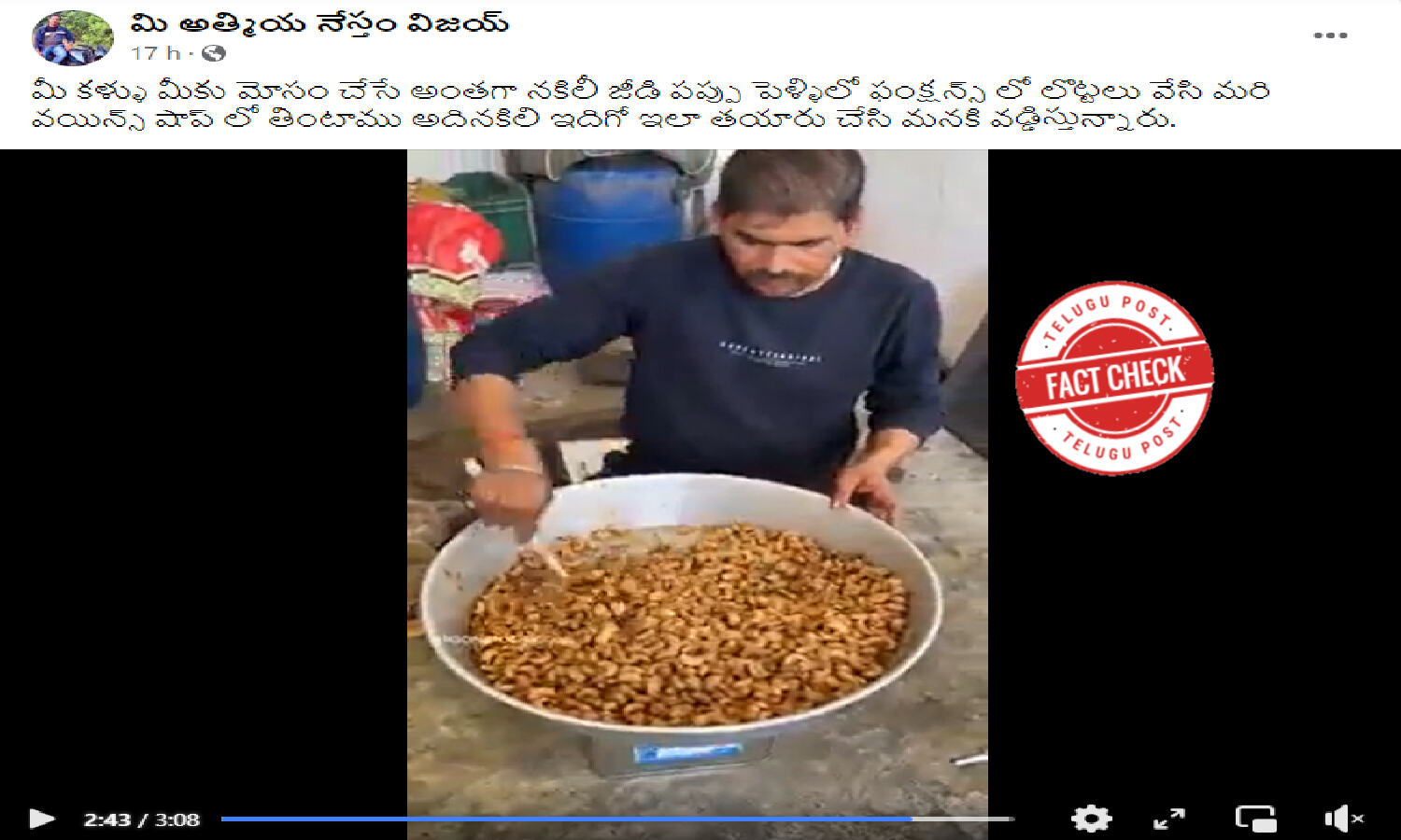 A video of a man preparing a savoury is being shared virally in Telugu with the claim that he is preparing fake cashews. The claim goes on to say that these artificially made cashews are served in marriages, and functions, and passed off as real cashew.