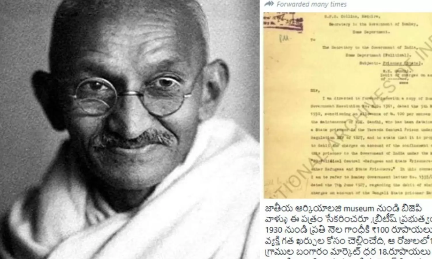 Claim (in Telugu): జాతీయ ఆర్కియాలజి museum నుండి బిజెపి వాళ్ళు ఈ పత్రం సేకరించరూ ,బ్రిటీష్ ప్రభుత్వం 1930 నుండి ప్రతి నెల గాంధీకి ₹100 రూపాయలు వ్యక్తి గత ఖర్చుల కోసం చెల్లించేది, ఆ రోజులలో10 గ్రాముల బంగారం మార్కెట్ ధర 18.రూపాయలు