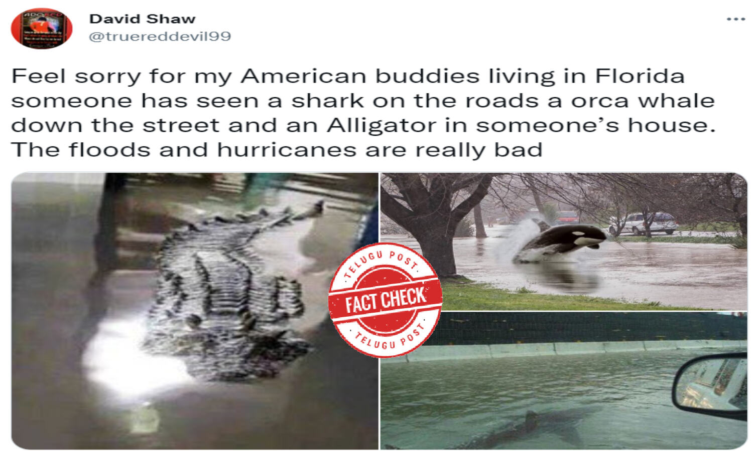 Prominent among them are a video of a shark swept into the streets at Fort Myers in Florida. Another image of an orca (killer whale) swimming in the streets is also going viral with the caption that due to heavy rains and streets getting flooded, an orca got out of its enclosure (Sea aquarium) and is swimming in the streets.
