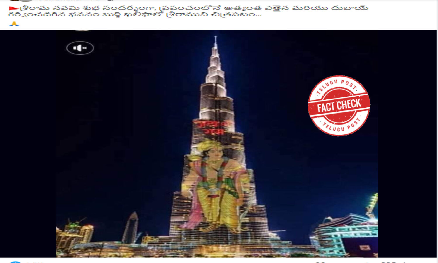 An image of Lord Shri Ram projected onto the Burj Khalifa building in Dubai is being shared virally on social media accounts with the narrative that on the occasion of Sri Rama Navami, the world’s largest building Burj Khalifa depicted an LED image of Lord Ram.