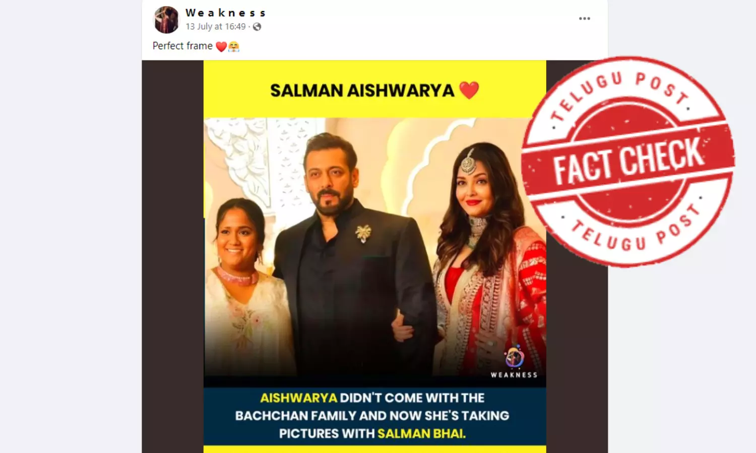 Before joining the wedding, the guests posed for the media outside the venue. An image showing Aishwarya Rai posing with Salman Kahn and his sister Arpita Khan is going viral with the claim that Aishwarya Rai and Salman Khan took a picture together after Aishwarya Rai ditched Abhishek Bachchan and his family.