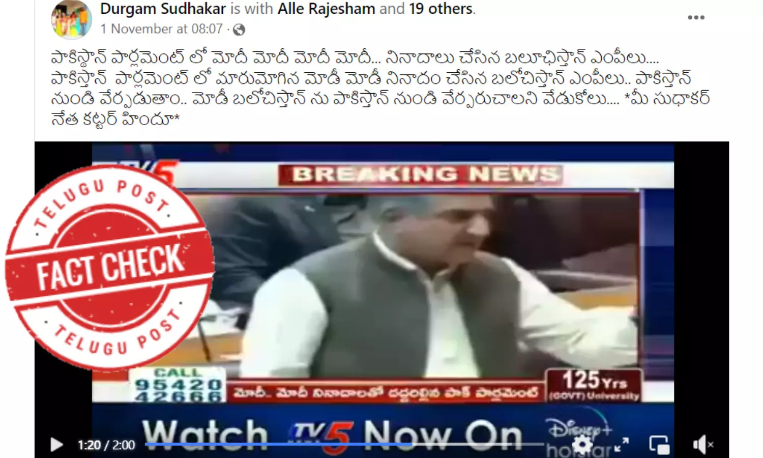 The claim in Telugu “పాకిస్థాన్ పార్లమెంట్ లో మోదీ మోదీ మోదీ మోదీ... నినాదాలు చేసిన బలూఛిస్తాన్ ఎంపీలు. పాకిస్తాన్ పార్లమెంట్ లో మారుమోగిన మోడీ మోడీ నినాదం చేసిన బలోచిస్తాన్ ఎంపీలు.. పాకిస్తాన్ నుండి వేరుపడుతాం.. మోడీ బలోచిస్తాన్ ను పాకిస్తాన్ నుండి మమ్మల్ని వేరు చేయాలని వేడుకోలు. మన శత్రుదేశం అయిన పాకిస్థాన్ కూడ. మన మోడీ గారిని పొగడుతూ ఉoటే ఇక్కడున్న కొందరు దళారి, బ్రోకర్, చెంచా, లోఫర్ గాళ్లకు నరేంద్రుని గొప్పతనం, నిజాయితీ తెలియడం లేదు .... జై శ్రీరామ్”