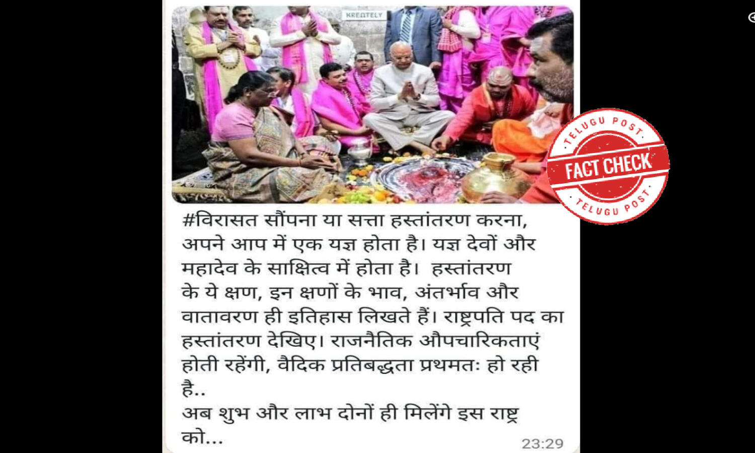 This claim was also viral in all platforms of social media with Hindi caption "#विरासत सौंपना या सत्ता हस्तांतरण करना, अपने आप में एक यज्ञ होता है। यज्ञ देवों और महादेव के साक्षित्व में होता है। हस्तांतरण के ये क्षण, इन क्षणों के भाव, अंतर्भाव और वातावरण ही इतिहास लिखते हैं। राष्ट्रपति पद का हस्तांतरण देखिए , वैदिक प्रतिबद्धता प्रथमतः हो रही है..."