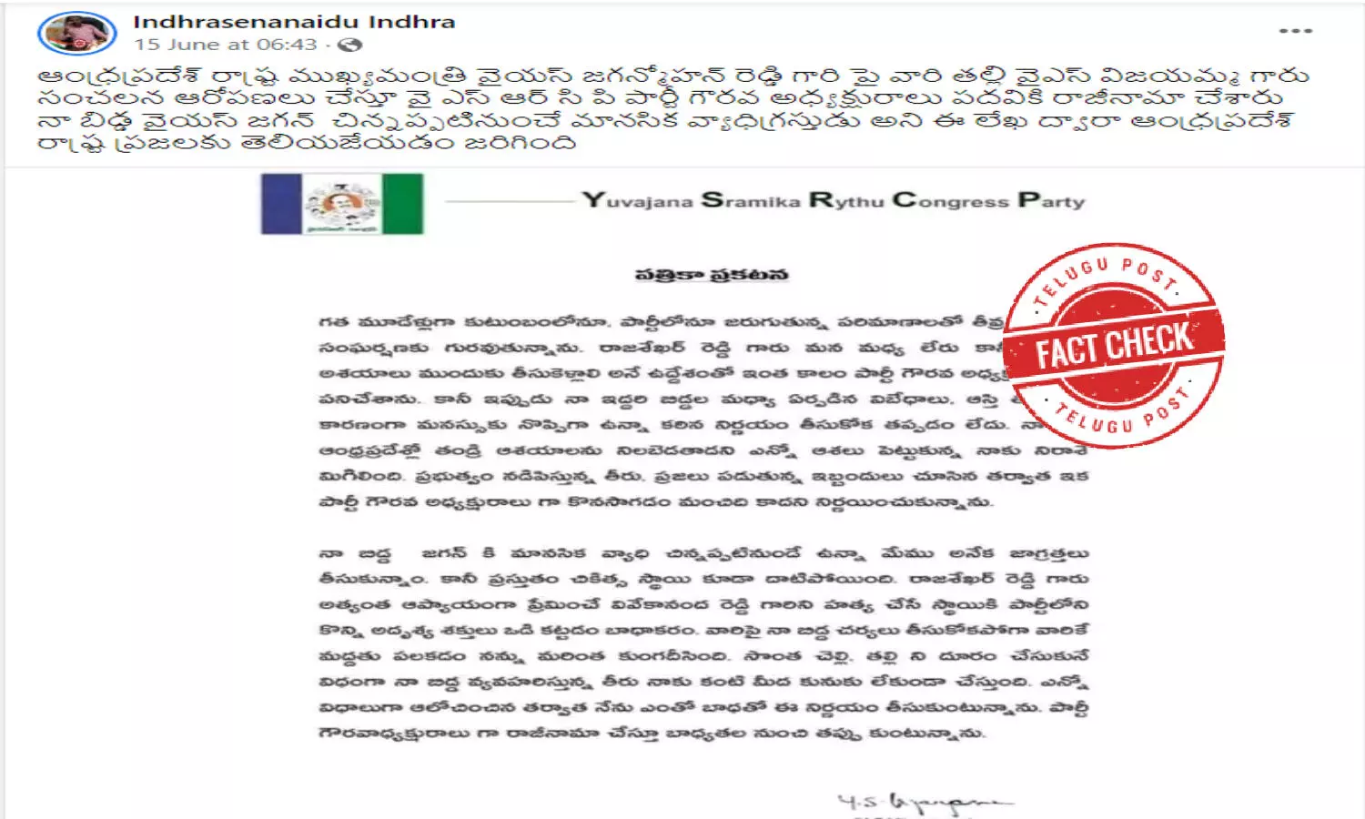 According to reports, the letter has been created with malicious intent by people. Officials of Crime Investigation Department have arrested a person from Guntur district for posting the fake letter. The signature of Ms. Vijayamma has been forged and letter was posted on social media group.