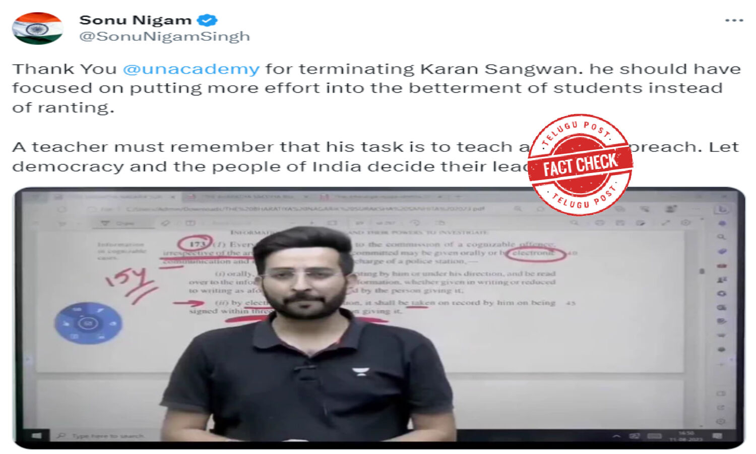 A tweet by a verified account under the name Sonu Nigam on X (formerly known as Twitter) is viral on social media claiming that Indian singer Sonu Nigam has shared his support towards educational technology company Unacademy, following recent controversy involving a teacher being fired