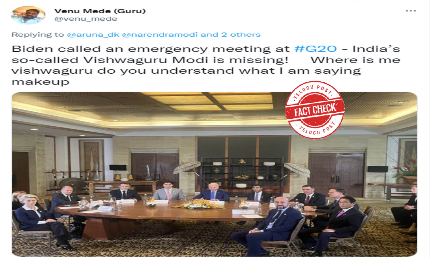 The claim goes as "Biden called an emergency meeting at #G20 - India's so-called Vishwaguru Modi is missing!"