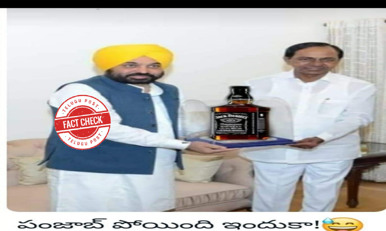 A photograph of Telangana chief minister K Chandrasekhar Rao is being widely shared on WhatsApp and other social network platforms. In that image, the chief minister is seen to be presenting a liquor bottle to his counterpart in Punjab, Bhagwant Mann Singh, and the people sharing it are questioning, 'Is this why (you) went to Punjab?'