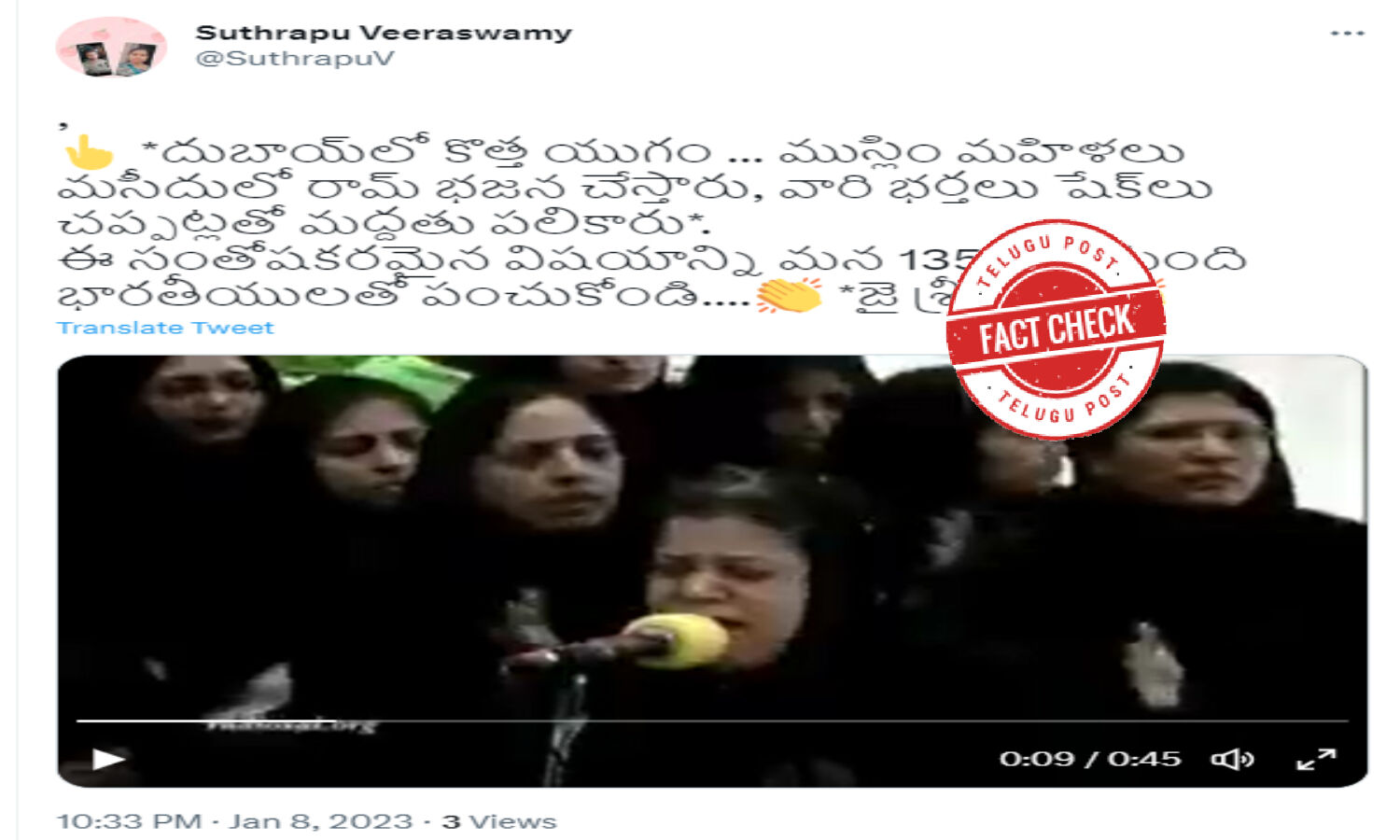 The video is in circulation with a caption in Telugu “*దుబాయ్లో కొత్త యుగం ... ముస్లిం మహిళలు మసీదులో రామ్ భజన చేస్తారు, వారి భర్తలు షేక్లు చప్పట్లతో మద్దతు పలికారు*. ఈ సంతోషకరమైన విషయాన్ని మన 135 కోట్ల మంది భారతీయులతో పంచుకోండి.... *జై శ్రీరామ్*”.
