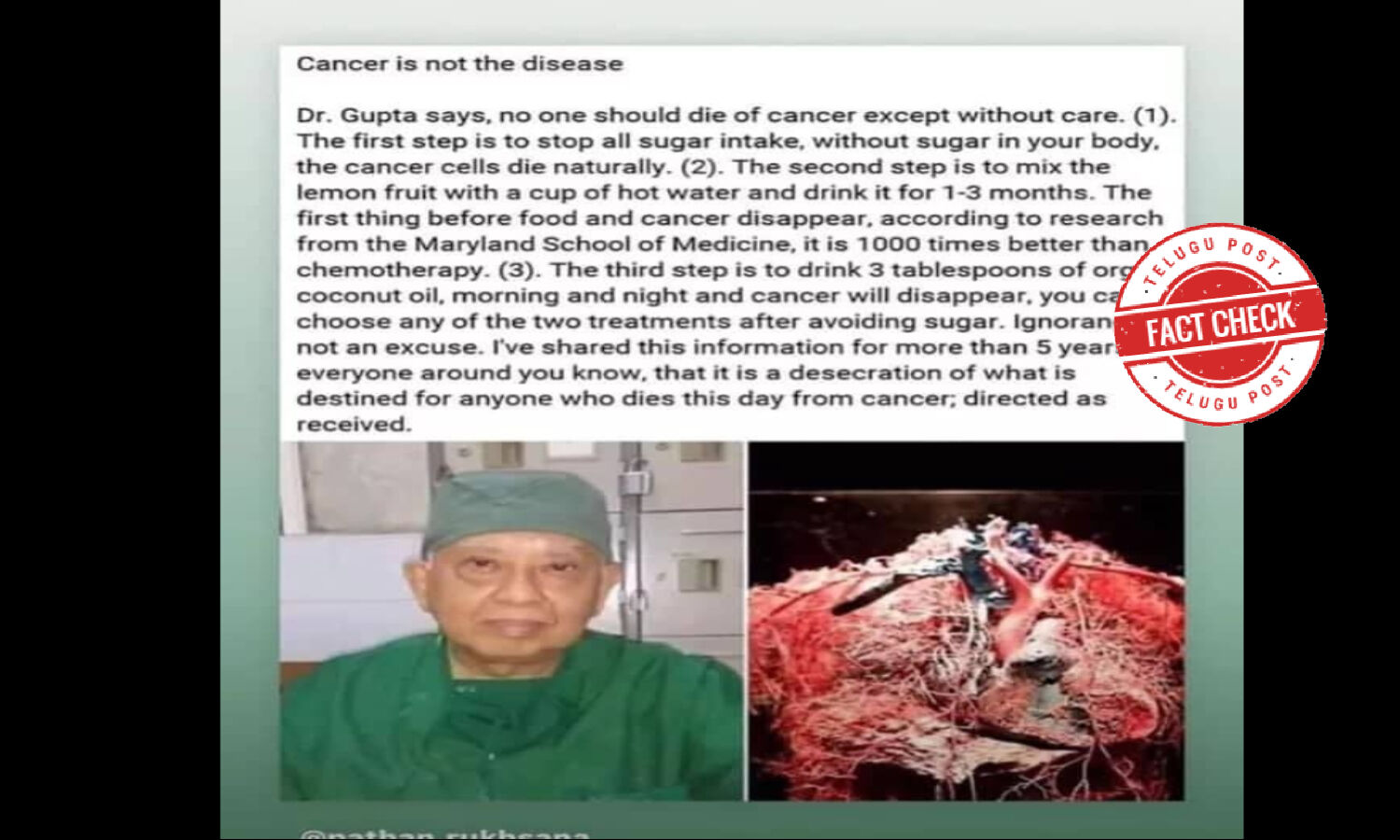 The long message goes as “Dr. Gupta says, No one must die of cancer except out of carelessness;(1). First step is to stop intake of sugar, without sugar in your body, cancer cells would die a natural death.(2). Second step is to blend lemon juice in a cup of hot water and drink it for about 1-3 months first thing before food and cancer would disappear, research by Maryland College of Medicine says, it's 1000 times better than chemotherapy.(3). Third step is to drink 3 spoonfuls of organic coconut oil, morning and night and the cancer would disappear, you can choose any of the two therapies after avoiding sugar.Ignorance is no excuse; I have been sharing this information for over 5 years. Let everyone around you know. God bless.”