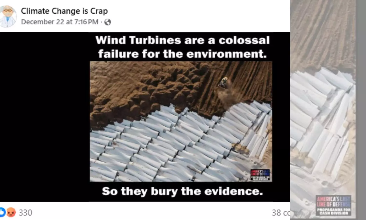 Meanwhile, a photo of piles of long, white wind turbines lying in a landfill is going viral on social media with the claim that these “wind turbines are a colossal failure for the environment. So, they bury the evidence (in soil).”