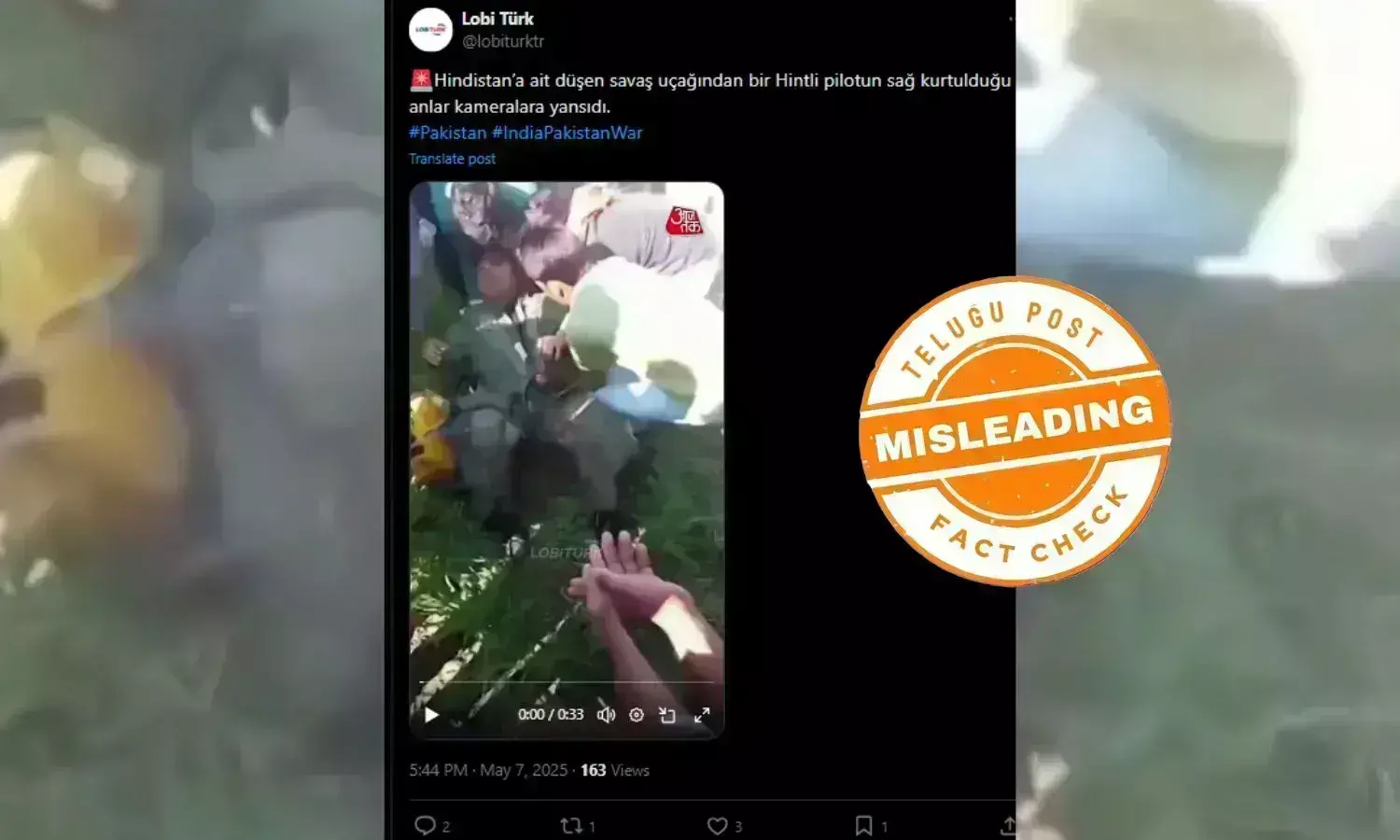 Social media has been flooded with misinformation regarding the attack. Several users are sharing videos showing different jet planes being shot down by the opposing army. One widely circulated video claims that an Indian pilot was rescued from a crashed plane. The viral video, shared with a caption in Turkish, translates to: “An Indian pilot surviving a crashed warplane was captured on camera.” Several Pakistani accounts have shared this claim widely.