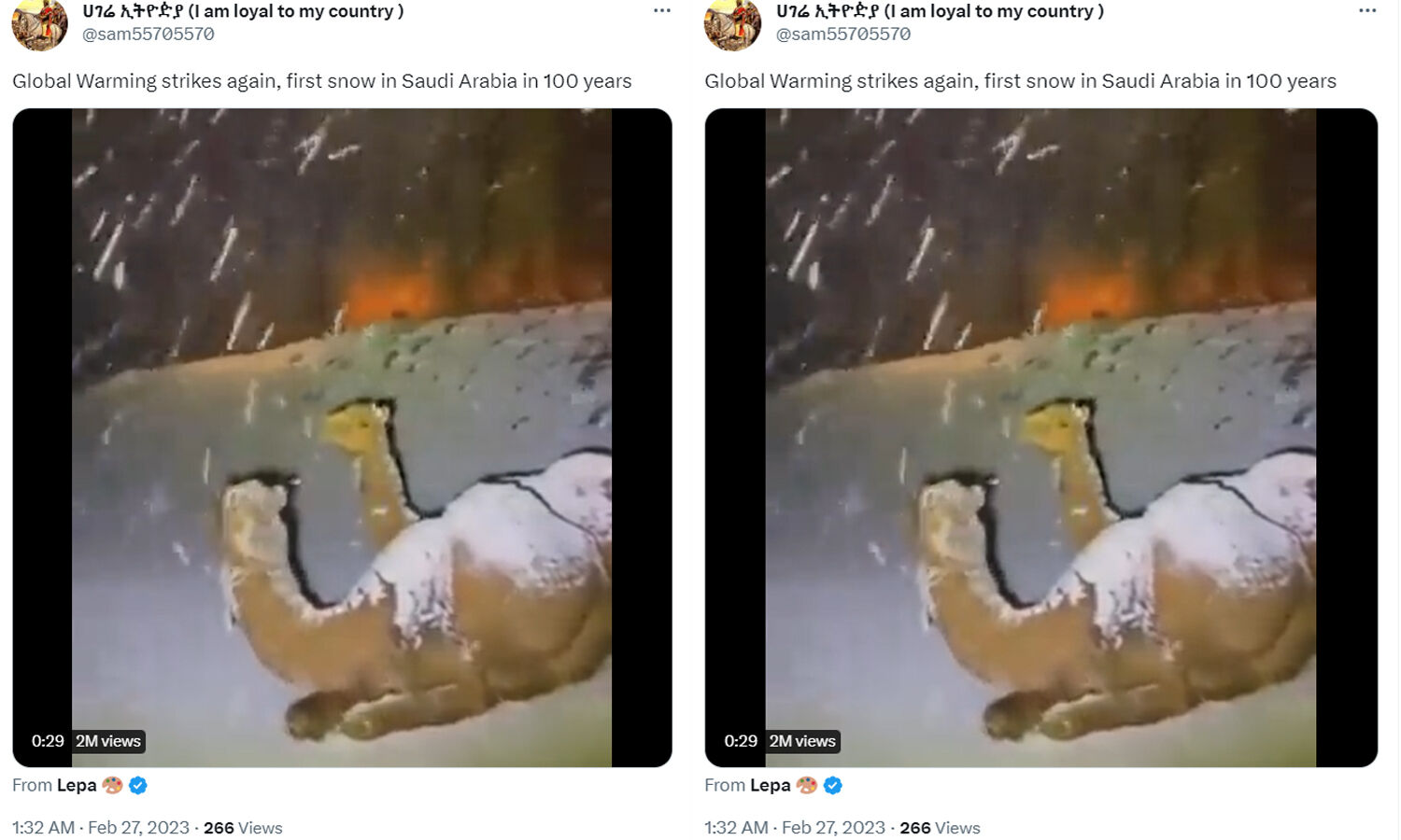 A video showing two camels sitting amidst heavy snowfall is viral on social media, especially on Twitter, with the claim that the video shows snowfall in Saudi Arabia, a first in the last 100 years. The video is shared with the implication that because of global warming, it is snowing in Saudi Arabia.