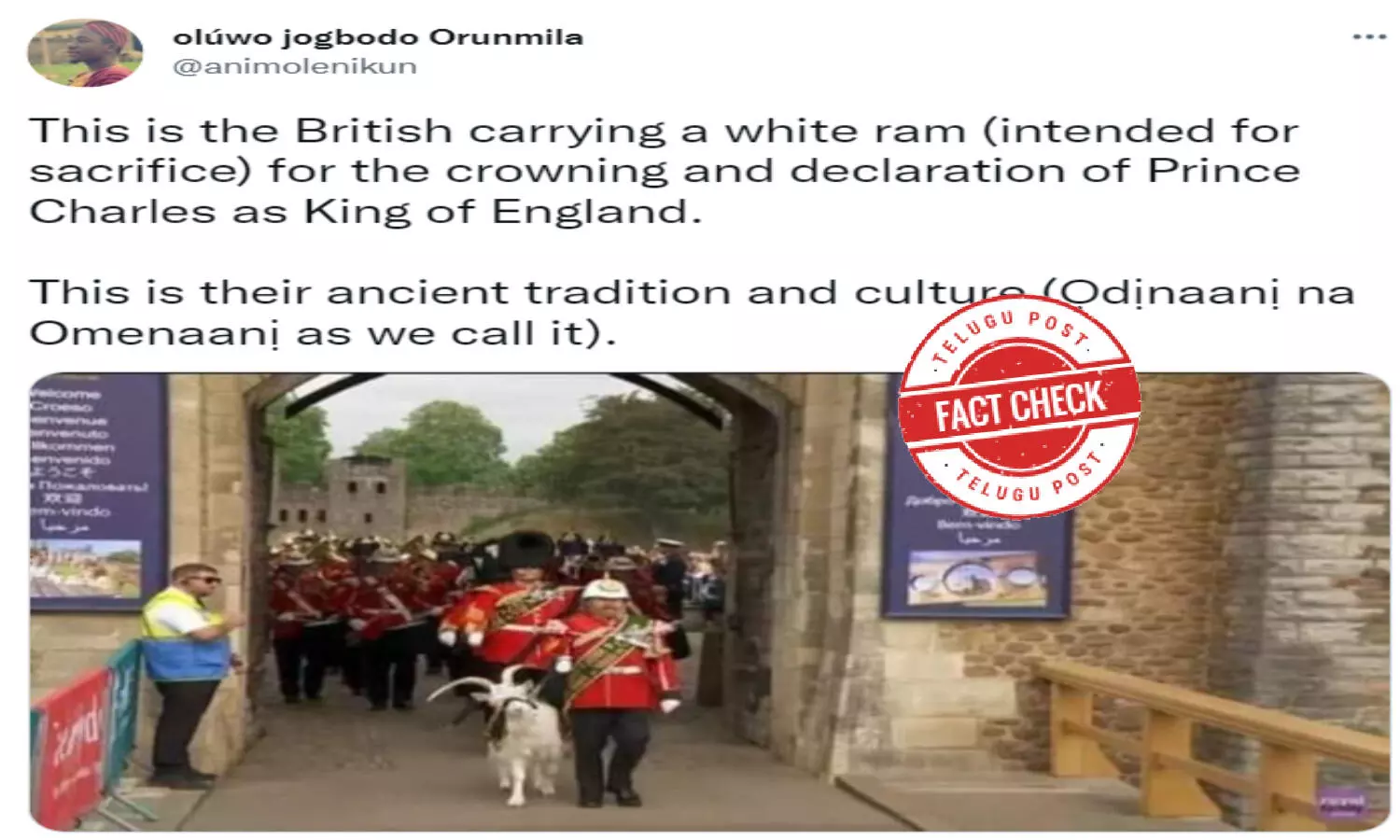 A few users of social media are sharing an image of a white goat, along with an English soldier, during the coronation of Prince Charles as the King of England. The goat is claimed to be intended for sacrifice during the occasion.