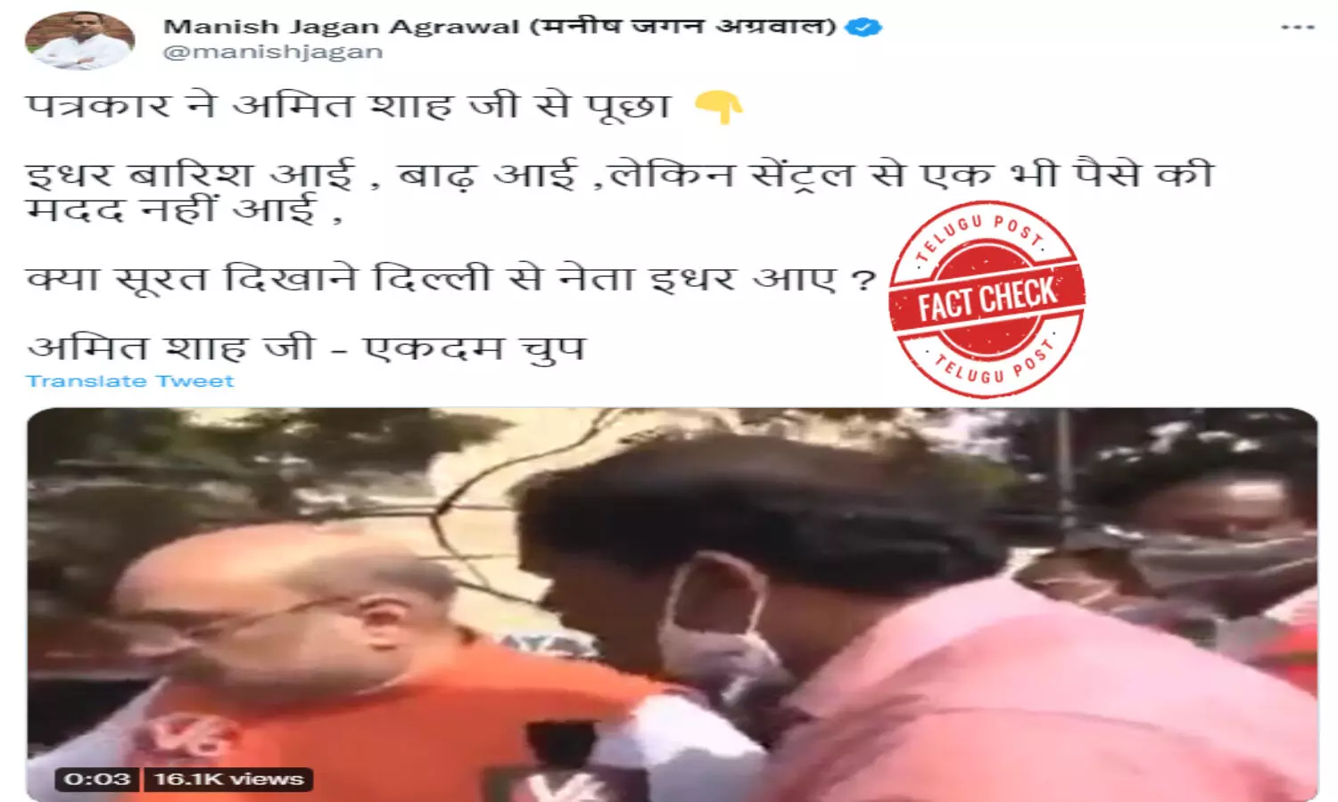 వరదల సమయంలో కేంద్ర ప్రభుత్వం తెలంగాణకు ఎందుకు సహాయం చేయలేదని ఓ విలేకరి ప్రశ్నించగా హోంమంత్రి మౌనంగా ఉన్నారని పేర్కొంటూ పలువురు యూజర్లు ట్విట్టర్లో వీడియోను షేర్ చేశారు. ట్విట్టర్ యూజర్ @manishjagan జులై 4, 2022న ఈ ట్వీట్ చేశాడు.