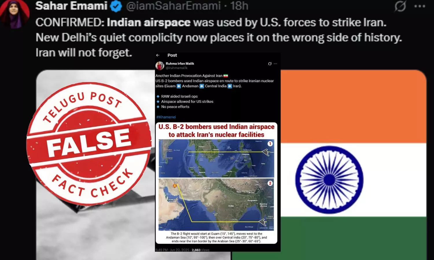 ఇరాన్ మీద దాడి చేసే సమయంలో భారత గగనతలాన్ని అమెరికా ఉపయోగించిందనే వాదనలో ఎలాంటి నిజం లేదు.