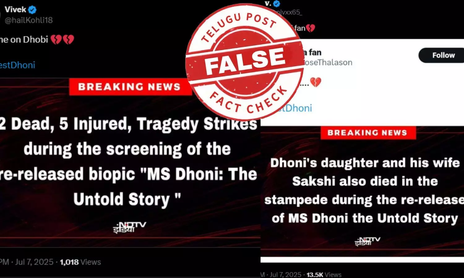 ధోని బయోపిక్ 'MS ధోని: ది అన్టోల్డ్ స్టోరీ' రీ రిలీజ్ ప్రదర్శన సమయంలో 2 మంది చనిపోయారు, 5 మంది గాయపడ్డారు, విషాదం చోటు చేసుకుంది అంటూ NDTV న్యూస్ కు సంబంధించిన గ్రాఫిక్ ప్లేట్ ను కూడా ప్రజలు పంచుకున్నారు. దీన్ని షేర్ చేసిన వారు Facebook , Xలో "Arrest Dhoni" వంటి హ్యాష్ట్యాగ్లను కూడా ఉపయోగించారు.