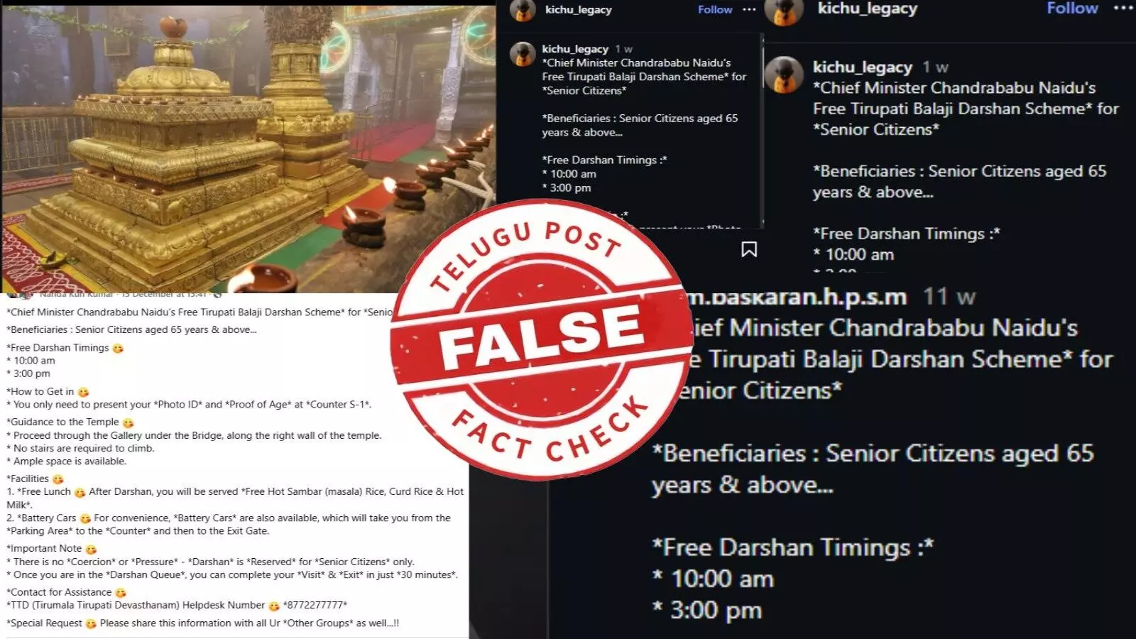 ఫ్యాక్ట్ చెక్: సీనియర్ సిటిజన్ల కోసం ముఖ్యమంత్రి చంద్రబాబు నాయుడు ఉచితంగా తిరుమల శ్రీవారి దర్శన పథకాన్ని తీసుకుని వచ్చారంటూ జరుగుతున్న ప్రచారంలో ఎలాంటి నిజం లేదు