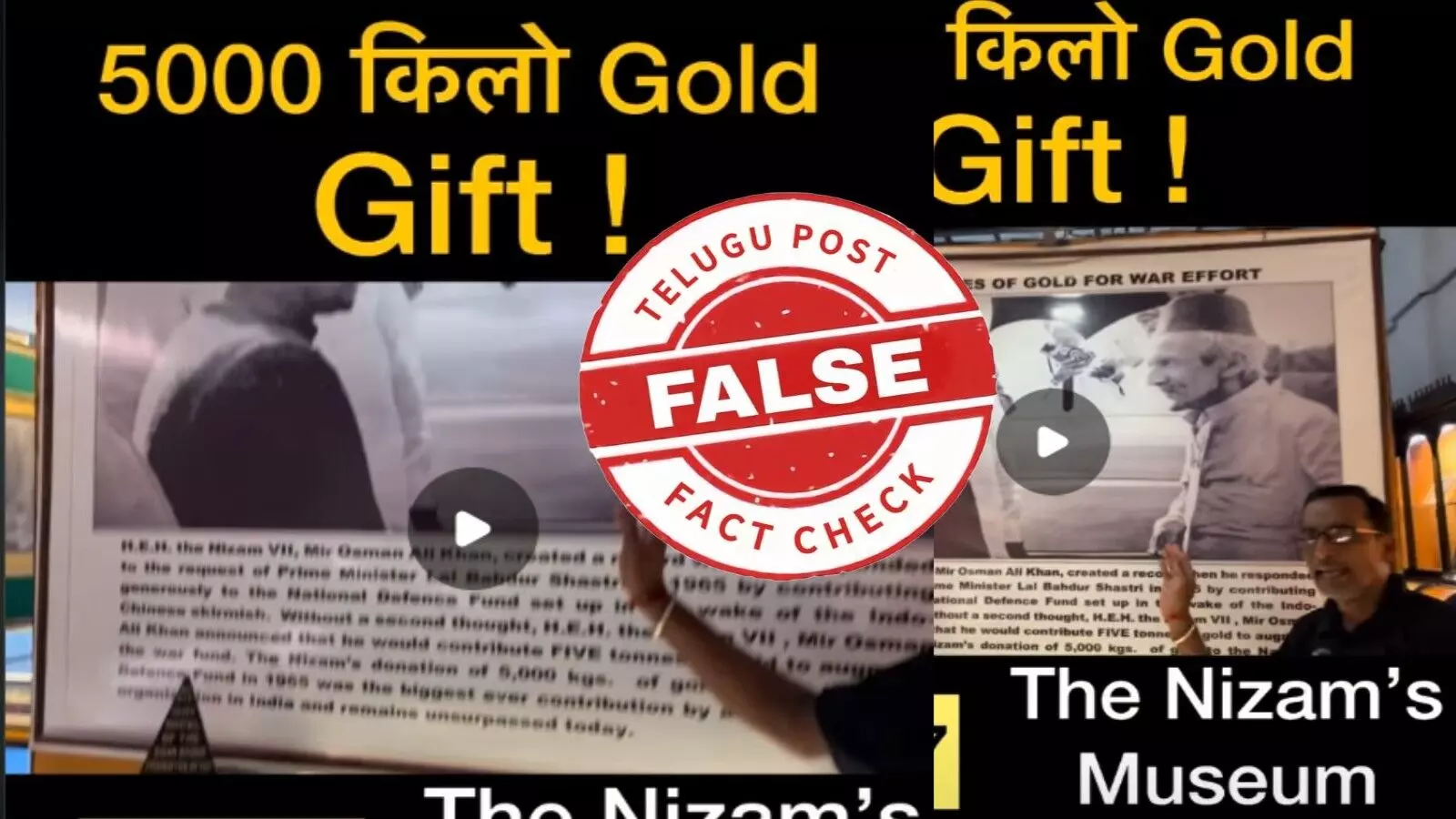 1965 ఇండో-పాక్ యుద్ధంలో, మీర్ ఉస్మాన్ అలీ ఖాన్ దేశ సైనిక ప్రయత్నాలకు మద్దతుగా భారత ప్రభుత్వానికి 5000 కిలోగ్రాముల బంగారాన్ని విరాళంగా ఇచ్చారని కొన్ని పోస్టులు సోషల్ మీడియాలో వైరల్ అవుతూ ఉన్నాయి.