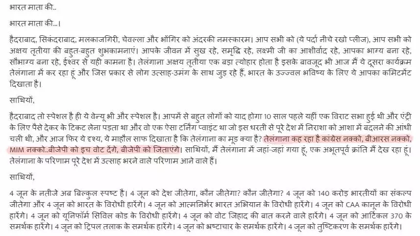 మేము క్లిప్ ఒరిజినల్ వెర్షన్ ను 3.26 టైమ్ స్టాంప్ వద్ద కనుగొన్నాము. మోదీ తన ప్రసంగంలో “కాంగ్రెస్ నక్కో, బీఆర్ఎస్ నక్కో, ఎంఐఎం నక్కో, బీజేపీ కో ఇచ్ ఓట్ దేంగే” అని అన్నారు. తెలంగాణ రాష్ట్ర ప్రజలు.. కాంగ్రెస్ కు కాదు.. బీఆర్ఎస్ కు కాదు.. ఎంఐఎంకు కాదు.. కేవలం బీజేపీకి మాత్రమే ఓటు వేస్తారని మోదీ చెప్పారు.