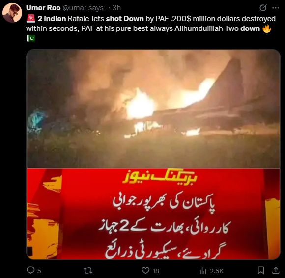 ఇంతలో భారత్ కు చెందిన రాఫెల్ యుద్ధ విమానాలను పాకిస్థాన్ కూల్చివేసిందంటూ కొన్ని పోస్టులు సోషల్ మీడియాలో వైరల్ అవుతూ ఉన్నాయి.