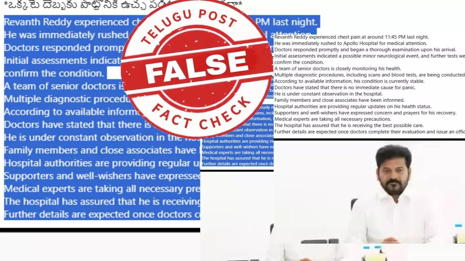 ఫ్యాక్ట్ చెక్: కేసీఆర్ ప్రెస్ మీట్ పెట్టిన తర్వాత అపోలో ఆసుపత్రిలో తెలంగాణ సీఎం రేవంత్ రెడ్డి చేరారంటూ జరుగుతున్న ప్రచారంలో ఎలాంటి నిజం లేదు
