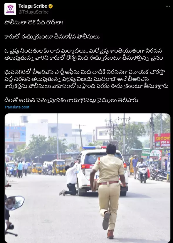 భువనగిరిలో బీఆర్ఎస్ పార్టీ ఆఫీసు మీద దాడికి నిరసనగా వినాయక చౌరస్తా వద్ద నిరసన తెలుపుతున్న వల్లపు విజయ్ ముదిరాజ్ అనే బీఆర్ఎస్ కార్యకర్తను పోలీసులు వాహనంలో బస్టాండ్ వరకు ఈడ్చుకుంటూ తీసుకెళ్లారు