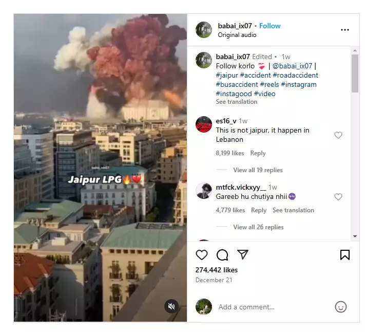 వైరల్ వీడియోకు జైపూర్ లో ఘటనకు ఎలాంటి సంబంధం లేదని మేము ధృవీకరించాం. లెబనాన్ రాజధాని బీరుట్ లో చోటు చేసుకున్న ఘటన అని ధృవీకరించాం.