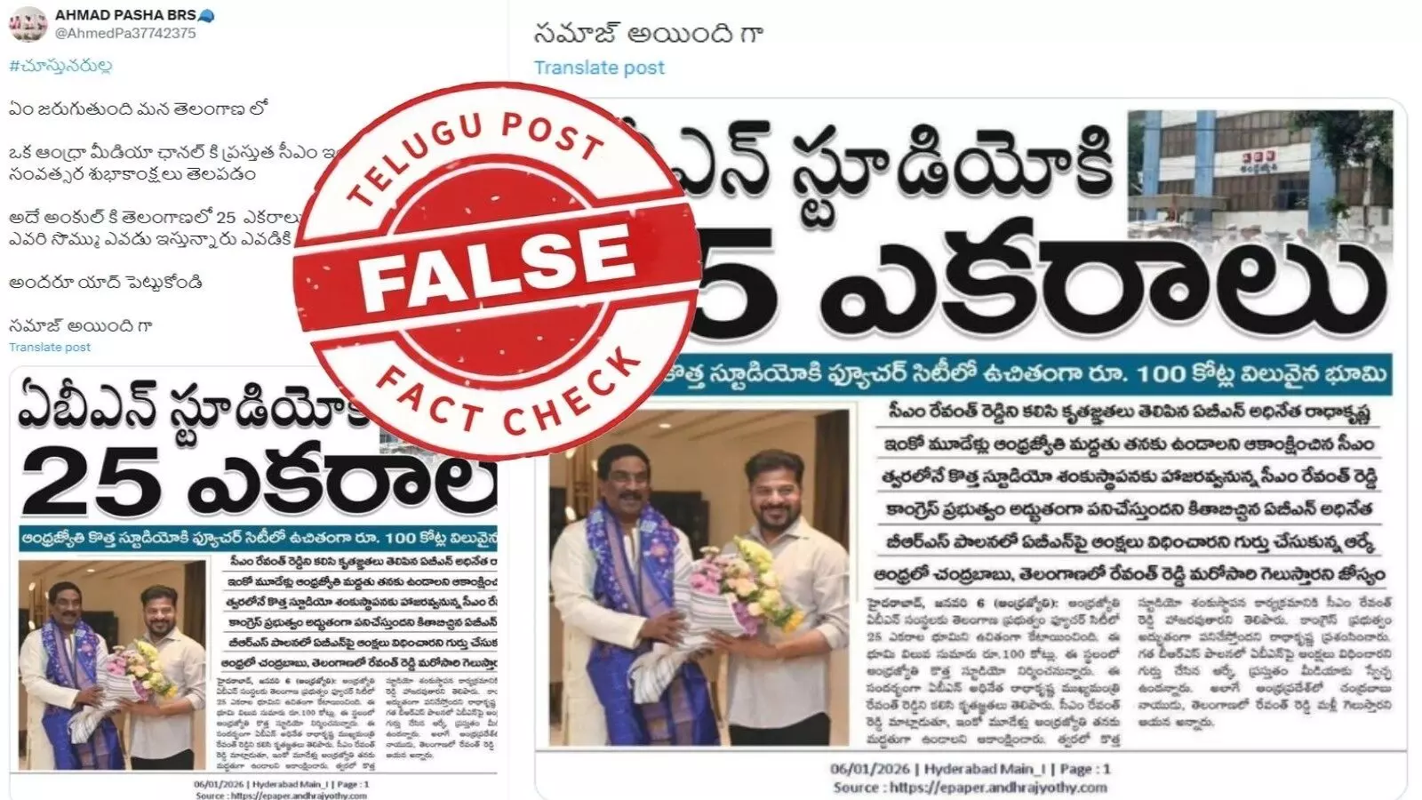 ఫ్యాక్ట్ చెక్: ఏబీఎన్ టీవీ ఛానల్ కు తెలంగాణ ముఖ్యమంత్రి రేవంత్ రెడ్డి 25 ఎకరాల స్థలాన్ని కేటాయించారనే పోస్టుల్లో ఎలాంటి నిజం లేదు