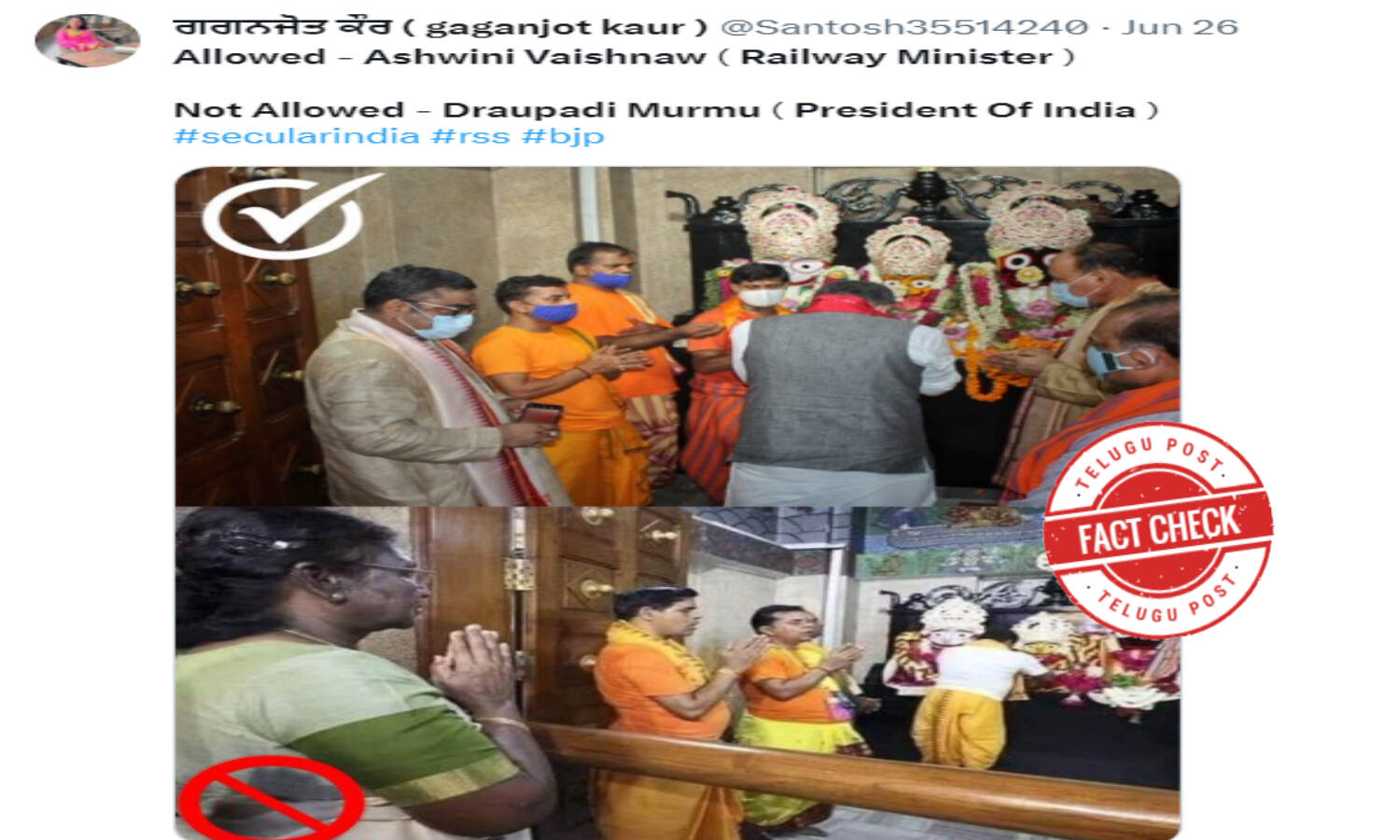 పూరీలోని జగన్నాథ ఆలయ గర్భగుడిలోకి రైల్వే మంత్రి అశ్విని వైష్ణవ్ను అనుమతించారని, అయితే భారత రాష్ట్రపతి ద్రౌపది ముర్మును అదే ఆలయంలోని గర్భగుడిలోకి అనుమతించలేదని కథనంతో రెండు చిత్రాలు వైరల్ అవుతూ ఉన్నాయి.