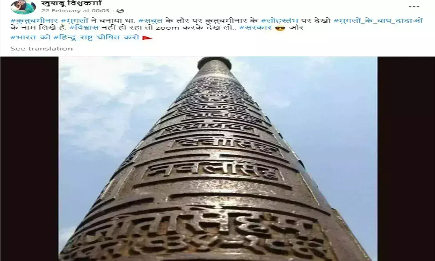 హిందీలో అనే శీర్షికతో చిత్రం షేర్ అయ్యింది. “कुतुब मीनार मुगलों ने बनाया था, यही रटा लगवाया था माड़ साहब ने। सबुत के तौर पर कुतुबमीनार के लोहस्तंभ पर देखो मुगलों के बाप दादाओं के नाम लिखे हैं, विश्वास नहीं हो रहा तो zoom करके देख लो। अब तो कागज बता दो रे ”