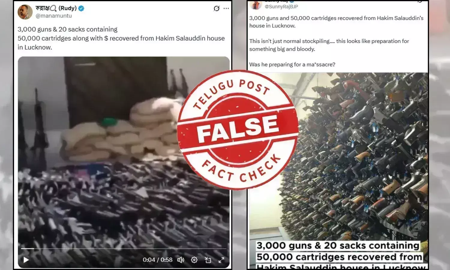 ఒక వీడియో “3,000 guns, 50,000 cartridges and cash recovered from Hakim Salauddin's house in Lucknow one day before Muharram. They are preparing for war. भीम आर्मी “ #Hindus #Rajasingh “PM Modi “ Yogi” “Islam” అనే క్యాప్షన్ తో షేర్ చేస్తున్నారు. 000 తుపాకులు, 50,000 తూటాలు స్వాధీనం చేసుకున్నట్లు ఈ పోస్టుల్లో తెలిపారు.