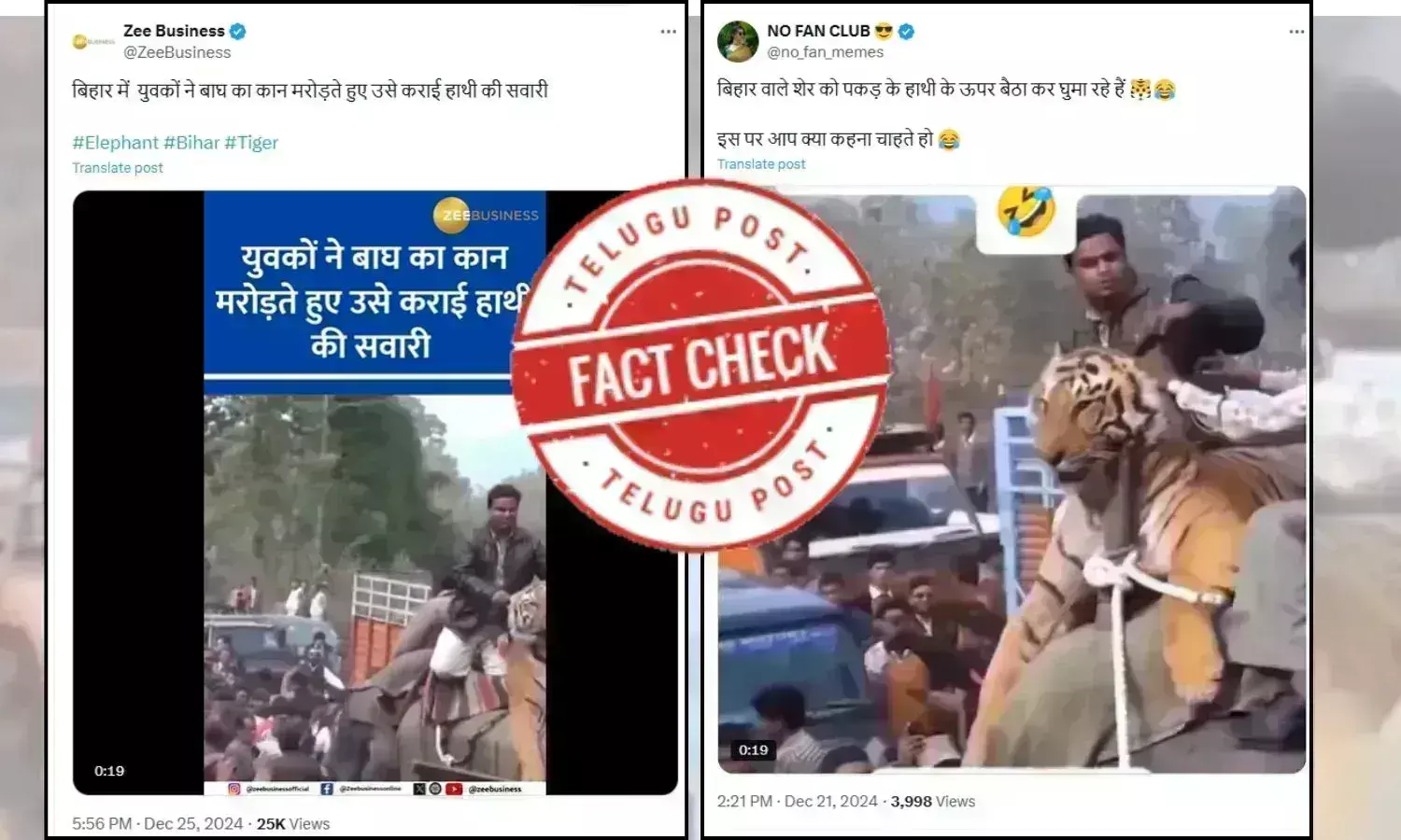 ఏనుగు వీపుపై పులిని కట్టేసి, దానితో పాటు ఇద్దరు వ్యక్తులు కూర్చుని, పులి చెవులను వెనక్కు లాగుతూ ప్రయాణిస్తున్న వీడియో వైరల్ అవుతూ ఉంది. ఈ వీడియో హిందీలో “ये बिहार है,यहां उड़ती चिड़िया को हल्दी लगा देते हैं,बाघ को ऐसे ही घुमाते हैं।” అనే క్యాప్షన్తో సోషల్ మీడియాలో వైరల్ అవుతూ ఉంది. ఈ వీడియో బీహార్కి చెందినదని, ఈ ఘటన ఇటీవల బీహార్లో జరిగిందని పేర్కొన్నారు.