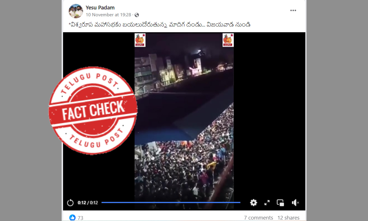 నవంబర్ 11, 2023న హైదరాబాద్లో నిర్వహించిన విశ్వరూప మహాసభకు హాజరయ్యేందుకు ప్రజలు హైదరాబాద్కు వెళుతున్నారని వైరల్ వీడియో గురించి జరుగుతున్న ప్రచారంలో ఎలాంటి నిజం లేదు. 2023 అక్టోబర్లో దుర్గాపూజ సందర్భంగా కోల్కతాలోని రైల్వే స్టేషన్లో ఉన్న ప్రజలకు సంబంధించినది. వైరల్ అవుతున్న వాదన ప్రజలను తప్పుదారి పట్టిస్తోంది.