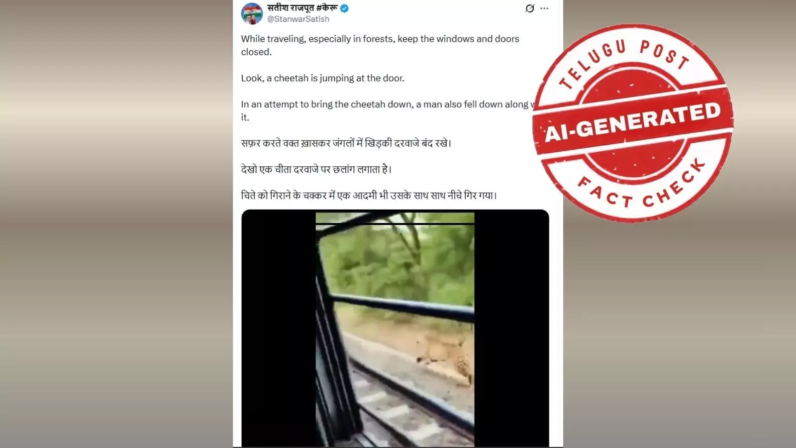 ಜನವರಿ 04, 2026ರಂದು ಎಕ್ಸ್ ಖಾತೆದಾರರೊಬ್ಬರು ತಮ್ಮ ಖಾತೆಯಲ್ಲಿ ʼWhile traveling, especially in forests, keep the windows and doors closed. Look, a cheetah is jumping at the door. In an attempt to bring the cheetah down, a man also fell down along with itʼ ಎಂದು ಬರೆದಿರುವುದನ್ನು ಕಾಣಬಹುದು. ಶೀರ್ಷಿಕೆಯನ್ನು ಕನ್ನಡಕ್ಕೆ ಅನುವಾದಿಸಿದಾಗ ʼಪ್ರಯಾಣ ಮಾಡುವಾಗ, ವಿಶೇಷವಾಗಿ ಕಾಡುಗಳಲ್ಲಿ, ಕಿಟಕಿಗಳು ಮತ್ತು ಬಾಗಿಲುಗಳನ್ನು ಮುಚ್ಚಿಡಿ. ನೋಡಿ, ಚಿರತೆಯು ಬಾಗಿಲಲ್ಲಿ ಜಿಗಿಯುತ್ತಿದೆ. ಚಿರತೆಯನ್ನು ಉರುಳಿಸುವ ಪ್ರಯತ್ನದಲ್ಲಿ, ಅದರೊಂದಿಗೆ ಒಬ್ಬ ಮನುಷ್ಯನು ಸಹ ಕೆಳಗೆ ಬಿದ್ದನುʼ ಎಂದು ಬರೆದು ಹಂಚಿಕೊಂಡಿದ್ದಾರೆ.
