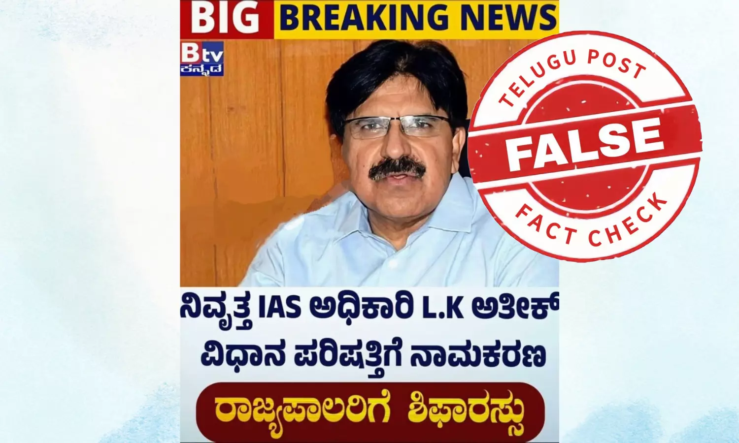 ಎಲ್.ಕೆ. ಅತೀಕ್ ವಿಧಾನ ಪರಿಷತ್ತಿಗೆ ನಾಮಕರಣ, ರಾಜ್ಯಪಾಲರಿಗೆ ಶಿಫಾರಸ್ಸು ಎಂದು ಸುಳ್ಳು ಸುದ್ದಿ ಹಂಚಿಕೆ