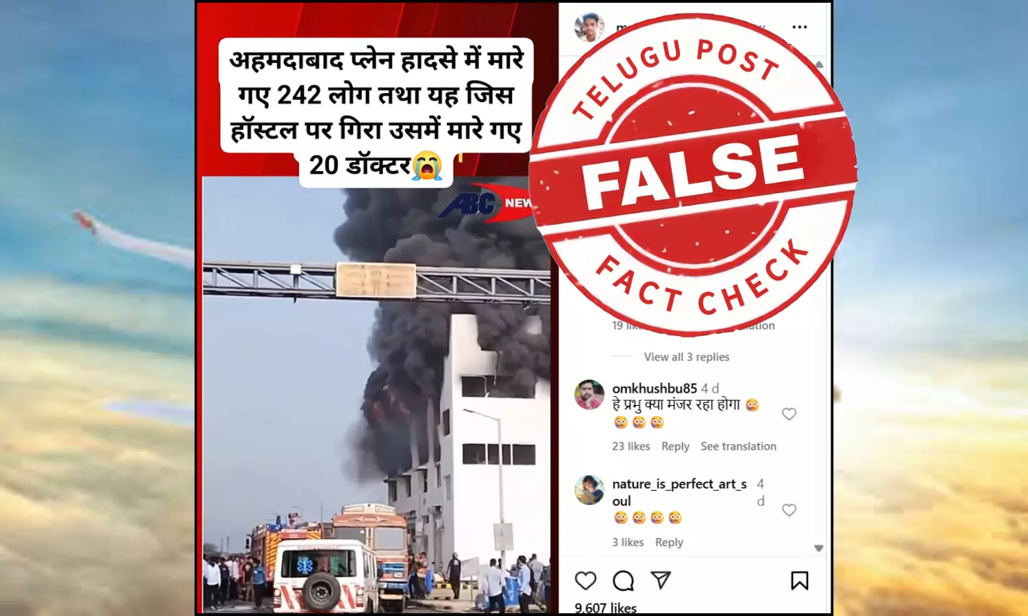 ಜೂನ್ 12, 2025ರಂದು ಇನ್ಸ್ಟಾಗ್ರಾಮ್ ಖಾತೆದಾರರೊಬ್ಬರು ತಮ್ಮ ಖಾತೆಯಲ್ಲಿ ʼअहमदाबाद प्लेन हादसे में मारे गए लोग तथा यह जिस हॉस्टल पर गिरा उसमें मारे गए डॉक्टर. Ahmedabad se London jaane wali plane Hui crash se upar log Mar Gayeʼ ಎಂಬ ಶೀರ್ಷಿಕೆಯೊಂದಿಗೆ ಕಟ್ಟಡವೊಂದರಲ್ಲಿ ಭಾರಿ ಬೆಂಕಿ ಕಾಣಿಸಿಕೊಂಡ ದೃಶ್ಯದೊಂದಿಗೆ ಹಂಚಿಕೊಂಡಿದ್ದಾರೆ. ಶೀರ್ಷಿಕೆಯನ್ನು ಕನ್ನಡಕ್ಕಟ ಅನುವಾದಿಸಿದಾಗ ʼಅಹಮದಾಬಾದ್ ವಿಮಾನ ಅಪಘಾತದಲ್ಲಿ 242 ಜನರು ಸಾವನ್ನಪ್ಪಿದ್ದಾರೆ ಮತ್ತು ಹಾಸ್ಟೆಲ್ ಕಟ್ಟಡದಲ್ಲಿ 20 ವೈದ್ಯರು ಸಾವನ್ನಪ್ಪಿದ್ದಾರೆʼ ಎಂದು ಬರೆದಿರುವುದನ್ನು ನೋಡಬಹುದು.