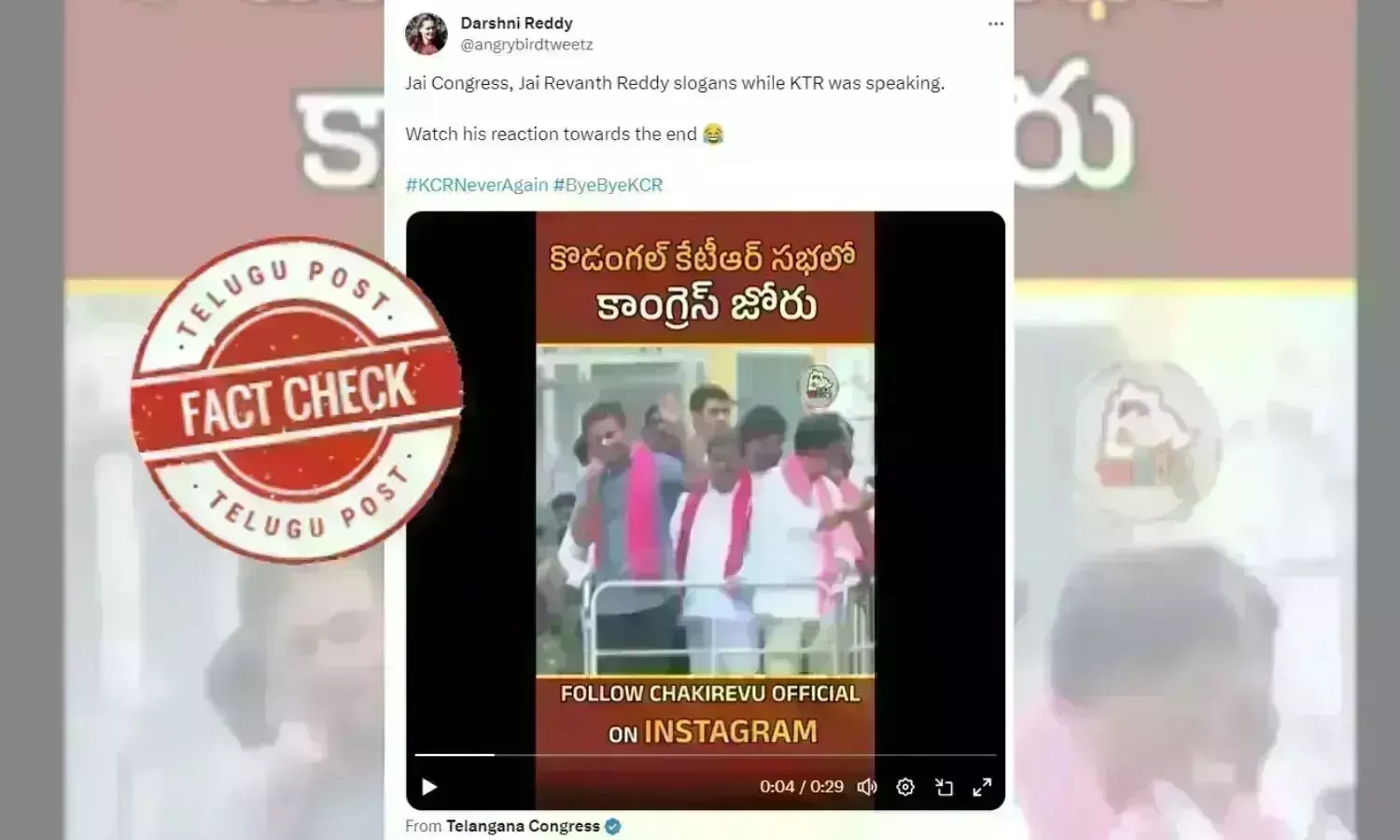 119 ಸದಸ್ಯ ಬಲದ ತೆಲಂಗಾಣ ವಿಧಾನಸಭೆಗೆ ನವೆಂಬರ್ 30, 2023 ರಂದು ಚುನಾವಣೆ ನಡೆಯಲಿದೆ. ಎಲ್ಲಾ ರಾಜಕೀಯ ಪಕ್ಷಗಳು ಬಿರುಸಿನ ಪ್ರಚಾರ ನಡೆಸುತ್ತಿವೆ. ಮುಖಂಡರು ಹಲವು ಕ್ಷೇತ್ರಗಳಿಗೆ ತೆರಳಿ ಮತದಾರರನ್ನು ಭೇಟಿ ಮಾಡುತ್ತಿದ್ದಾರೆ. ತೆಲಂಗಾಣ ಸಚಿವ ಕೆಟಿ ರಾಮರಾವ್ ಅವರ ಪ್ರಚಾರದ ವಿಡಿಯೋ ಸಾಮಾಜಿಕ ಜಾಲತಾಣಗಳಲ್ಲಿ ವೈರಲ್ ಆಗುತ್ತಿದೆ. ಕೊಡಂಗಲ್ ಕ್ಷೇತ್ರದಲ್ಲಿ ಜನರು ಕಾಂಗ್ರೆಸ್ ಪಕ್ಷ ಮತ್ತು ತೆಲಂಗಾಣ ಕಾಂಗ್ರೆಸ್ ಪಕ್ಷದ ಅಧ್ಯಕ್ಷ ರೇವಂತ್ ರೆಡ್ಡಿ ಅವರನ್ನು ಬೆಂಬಲಿಸಿ ಘೋಷಣೆಗಳನ್ನು ಕೂಗಿದ್ದಾರೆ ಎಂಬ ಪೋಸ್ಟ್ಗಳು ವೈರಲ್ ಆಗುತ್ತಿವೆ. ಕೆಟಿಆರ್ ಮಾತನಾಡುವಾಗ ಜೈ ಕಾಂಗ್ರೆಸ್, ಜೈ ರೇವಂತ್ ರೆಡ್ಡಿ ಘೋಷಣೆ ಕೂಗಿದರು. ಕೊನೆಯವರೆಗೂ ಅವರ ಪ್ರತಿಕ್ರಿಯೆಯನ್ನು ವೀಕ್ಷಿಸಿ #KCRNeverAgain #ByeByeKCR” ಎಂದು ವಿಡಿಯೋಗೆ ಶೀರ್ಷಿಕೆ ನೀಡಿದ್ದಾರೆ. ಕೆಟಿಆರ್ ಮಾತನಾಡುವಾಗ ಜೈ ಕಾಂಗ್ರೆಸ್, ಜೈ ರೇವಂತ್ ರೆಡ್ಡಿ ಎಂದು ಘೋಷಣೆಗಳನ್ನು ಕೂಗಿದ್ದಾರೆ ಎಂದು ಸಾಮಾಜಿಕ ಜಾಲತಾಣಗಳಲ್ಲಿ ಪೋಸ್ಟ್ ಗಳನ್ನು ಹಾಕಲಾಗಿತ್ತು.