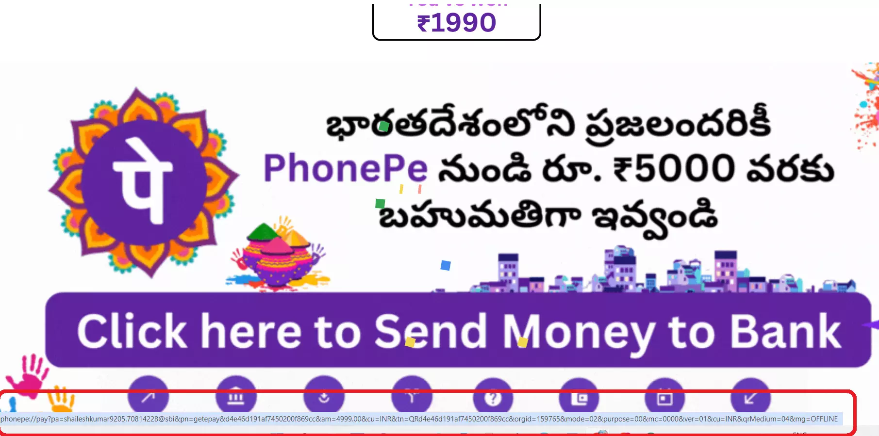 ಫೋನ್ಪೇ ಬಳಕೆದಾರರಿಗೆ ಹೋಳಿ ಹಬ್ಬದ ಪ್ರಯುಕ್ತ ಕ್ಯಾಶ್ಬ್ಯಾಕ್ ಜೊತೆಗೆ ಸ್ಕ್ರಾಚ್ ಕಾರ್ಡ್ನ್ನು ನೀಡಲಾಗುತ್ತಿದೆ ಎಂದು ವೆಬ್ಸೈಟ್ನಲ್ಲಿ ಬರೆದುಕೊಂಡಿದ್ದರು. ಸ್ಕ್ರ್ಯಾಚ್ ಮಾಡಿದಾಗ ಫೋನ್ಪೇನಲ್ಲಿ ನಿಮಗೆ ರೂ. 1,990 ಅಷೇ ಅಲ್ಲ, 5000 ಹಣವನ್ನು ನಿಮ್ಮ ಬ್ಯಾಂಕ್ ಖಾತೆಗೆ ಕಳುಹಿಸಲು ಈ ಪೇಜ್ನಲ್ಲಿ ಕಾಣುವ ಲಿಂಕ್ಗೆ ಕ್ಲಿಕ್ ಮಾಡಿ ಎಂದು ಬರೆದಿತ್ತು. ಲಿಂಕ್ ಮೇಲೆ ಕ್ಲಿಕ್ ಮಾಡಿದಾಗ ಬೇರೆಯ ಪೇಜಿಗೆ ವರ್ಗಾಯಿಸಿತು. ಆ ಲಿಂಕನ್ನು ಕ್ಲಿಕ್ ಮಾಡಿದರೆ ನಮ್ಮ ಖಾತೆಯ ಡೇಟಾವನ್ನು ಕಡಿಯುವ ಸಾಧ್ಯತೆಯೂ ಇದೆ.