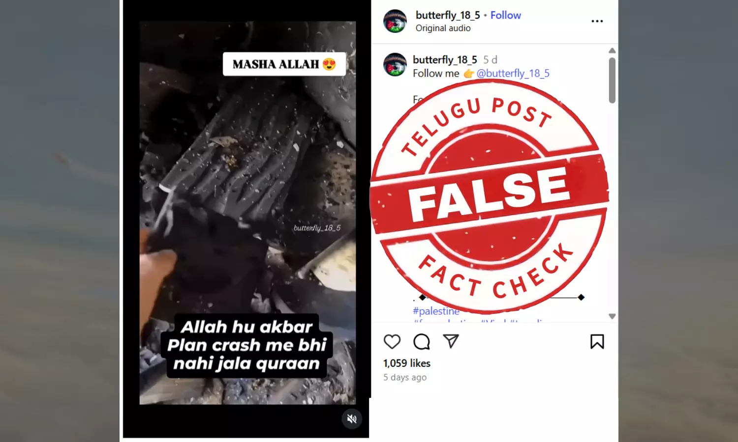 ಇತ್ತೀಚಿಗೆ ಸಾಮಾಜಿಕ ಜಾಲತಾಣದಲ್ಲಿ ಏರ್ ಇಂಡಿಯಾ ವಿಮಾನ ಅಪಘಾತದ ನಂತರದ ವಿಡಿಯೋವೆಂಬ ಶೀರ್ಷಿಕೆಯೊಂದಿಗೆ ವಿಡಿಯೋವೊಂದು ಹಂಚಿಕೊಳ್ಳಲಾಗುತ್ತಿದೆ. ಇದರಲ್ಲಿ ಕುರಾನ್ನ ಒಂದು ಪ್ರತಿಯು ಬೆಂಕಿಯಿಂದ ಸುರಕ್ಷಿತವಾಗಿ ಉಳಿದಿದೆ ಎಂದು ಹೇಳಲಾಗುತ್ತಿದೆ. ಈ ವೀಡಿಯೊವನ್ನು ಅಹಮದಾಬಾದ್ ವಿಮಾನ ಅಪಘಾತದ ಭಗ್ನಾವಶೇಷದಿಂದ ಕಂಡುಬಂದ ಕುರಾನ್ ಎಂದು ಕೆಲವರು ಹೇಳುತ್ತಿದ್ದಾರೆ, ಇದು “ಪವಾಡ” ಎಂದು ಚಿತ್ರಿಸಲಾಗುತ್ತಿದೆ.