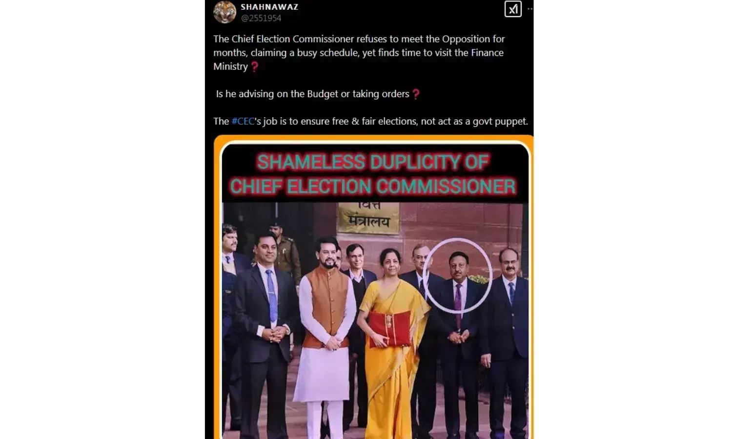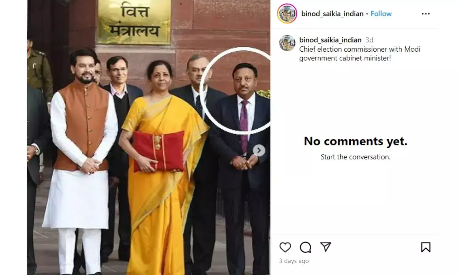 ഈ വർഷത്തെ കേന്ദ്ര ബജറ്റിന് മുന്നോടിയായി മുഖ്യ തെരഞ്ഞെടുപ്പ് ഓഫീസർ ധനമന്ത്രി നിർമല സീതാരാമനെ കണ്ടെന്ന സാമൂഹ്യ മാധ്യമങ്ങളിലെ പ്രചാരണം തെറ്റിധരിപ്പിക്കുന്നതാണ്. ചിത്രം 2020ലേത് ആണെന്ന് അന്വേഷണത്തിൽ കണ്ടെത്തി. പ്രചരിക്കുന്ന ചിത്രം 2020 - 2021 കേന്ദ്ര ബജറ്റിന് മുന്നോടിയായി ധനമന്ത്രി രാഷ്ട്രപതി ഭവനിലേക്ക് നോർത്ത് ബ്ലോക്കിൽ നിന്നിറങ്ങുമ്പോൾ എടുത്തതാണെന്ന് കണ്ടെത്തി. ഇപ്പോഴത്തെ മുഖ്യ തെരഞ്ഞെടുപ്പ് ഓഫീസർ രാജീവ് കുമാറും ചിത്രത്തിലുണ്ട്. എന്നാൽ രാജീവ് കുമാർ അന്ന് ഫിനാൻസ് സെക്രട്ടറിയായിരുന്നുവെന്നും അശോക് ലവാസയായിരുന്നു മുഖ്യ തെരഞ്ഞെടുപ്പ് ഓഫീസറെന്നും അന്വേഷണത്തിൽ വ്യക്തമായി