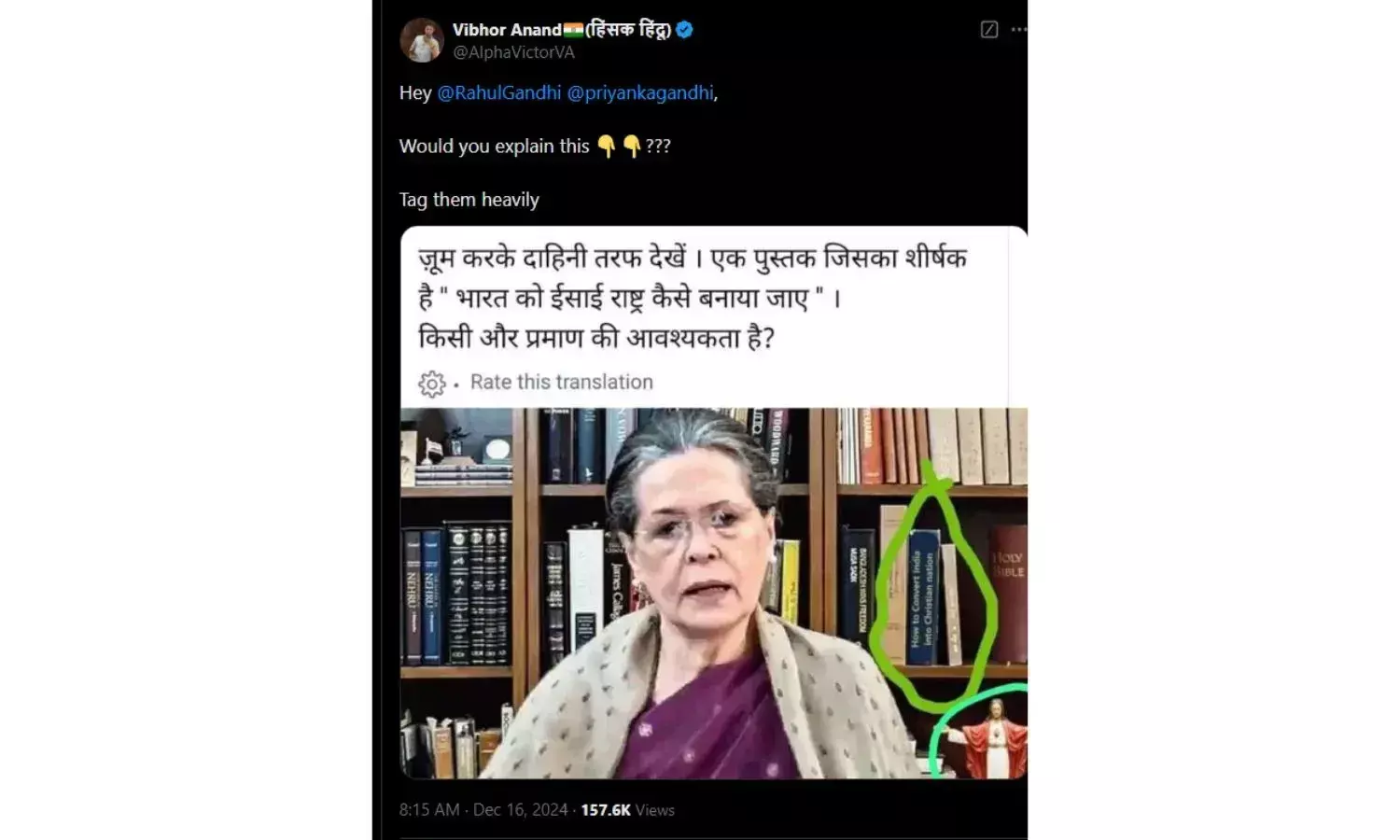 ചിത്രം സൂം ചെയ്ത് സൂക്ഷ്മമമായി നോക്കൂ, ഇന്ത്യയെ എങ്ങനെ ക്രൈസ്തവ രാഷ്ട്രമാക്കാം എന്ന പുസ്തകമാണ് ഷെൽഫിൽ. മറ്റെന്തെങ്കിലും തെളിവിന്റെ ആവശ്യമുണ്ടോ? എന്ന ഹിന്ദി അടിക്കുറിപ്പോടെയുള്ള പോസ്റ്റാണ് എക്സ് അക്കൌണ്ടിൽ പ്രചരിക്കുന്ന ഒരു പോസ്റ്റ്. ഡൽഹിയിലെ അഭിഭാഷകൻ കൂടിയായ വിഭർ ആനന്ദ് എന്ന വ്യക്തിയുടെ എക്സ് അക്കൌണ്ടിൽ ഇത് പോസ്റ്റ് ചെയ്തത് രാഹുൽ ഗാന്ധിയെയും പ്രിയങ്ക ഗാന്ധിയെയും ടാഗ് ചെയ്താണ്. ഇത് വിശദീകരിക്കാമോ? എന്ന ചോദ്യത്തോടെയാണ് പോസ്റ്റ്. പ്രചരിക്കുന്ന പോസ്റ്റും ലിങ്കുമാണ് ചുവടെ.