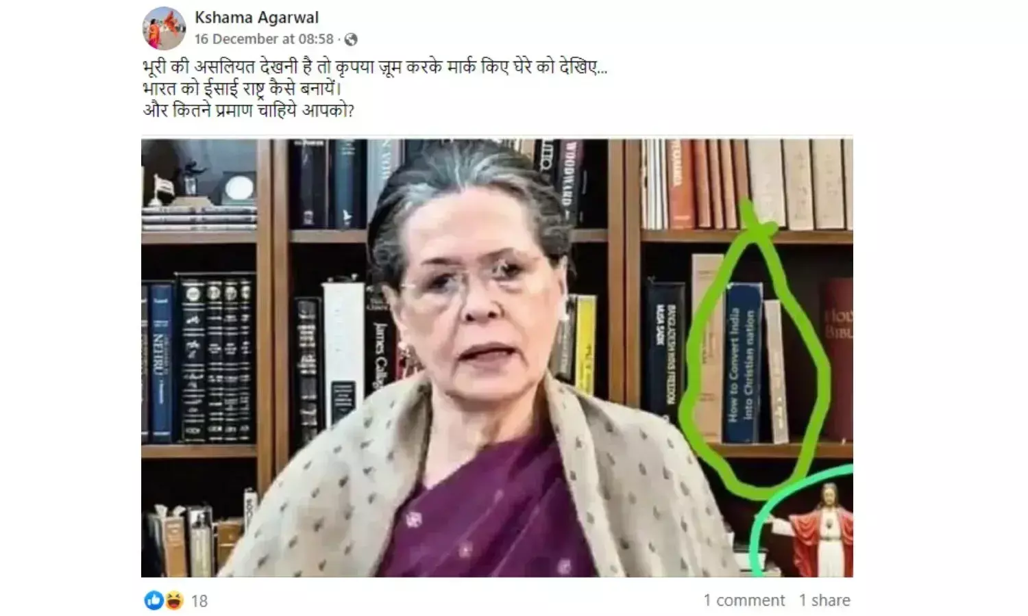രാജ്യസഭാ എംപിയും കോൺഗ്രസ് നേതാവുമായ സോണിയ ഗാന്ധിയുടെ ചിത്രം സാമൂഹ്യ മാധ്യമങ്ങളിൽ പ്രചരിക്കുകയാണ്. ചിത്രത്തിൽ സോണിയ ഗാന്ധിക്ക് പിന്നിലുള്ള പുസ്തക ഷെൽഫിലെ പുസ്തകത്തെ ചുറ്റിപ്പറ്റിയാണ് പ്രചാരണം. ഇന്ത്യയെ എങ്ങനെ ക്രൈസ്ത രാഷ്ട്രമാക്കാം എന്നർഥം വരുന്ന ഇംഗ്ലിഷ് പുസ്തകമാണ് ഷെൽഫിൽ. തൊട്ടടുത്തായി വിശുദ്ധ ബൈബിളുമുണ്ട്. സോണിയ ഗാന്ധിക്ക് സമീപം യേശു ക്രിസ്തുവിന്റെ പ്രതിമയും കാണാം.