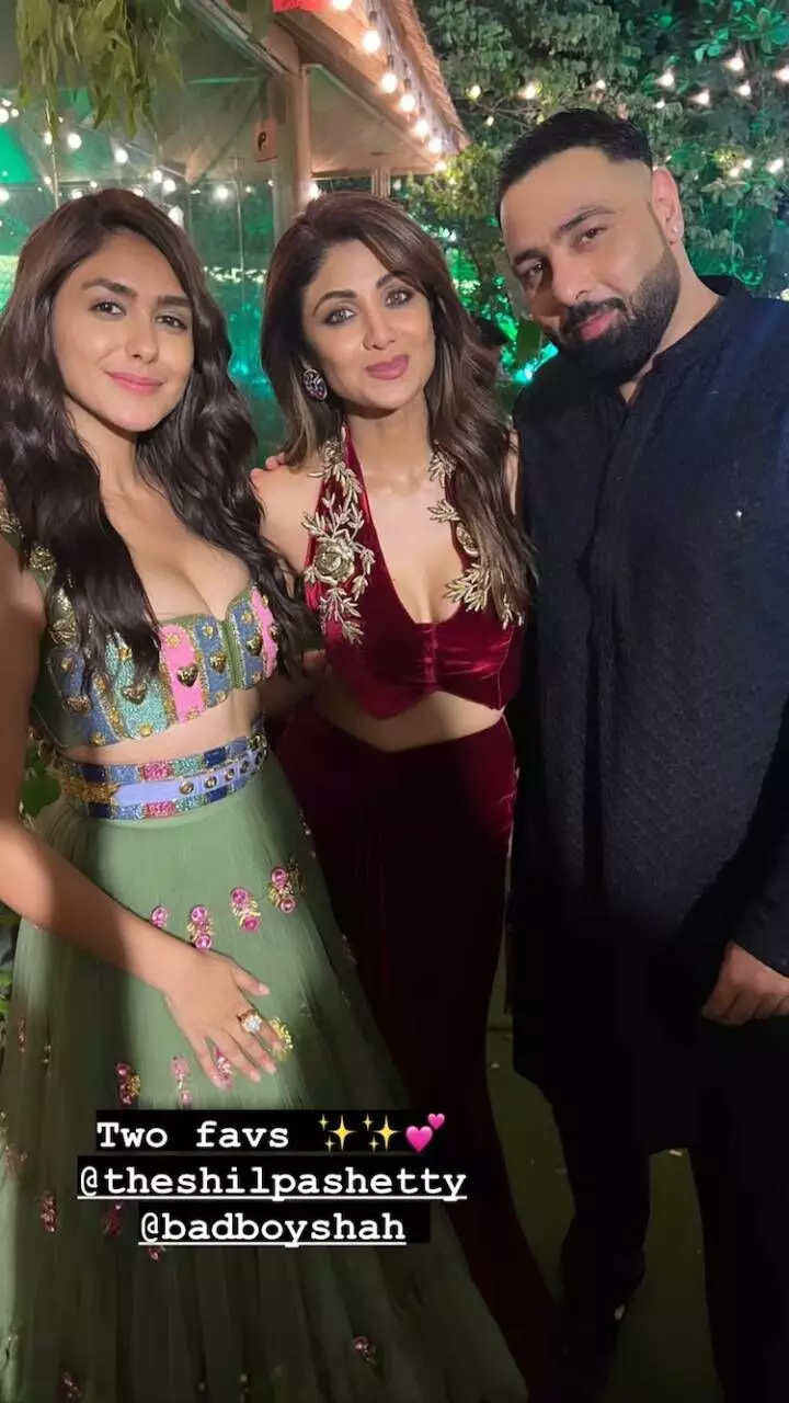 నవంబర్ 10న బాలీవుడ్ హీరోయిన్ శిల్పా శెట్టి ఆమె ఇంట దివాళీ బ్యాష్ ఏర్పాటు చేశారు. ఈ కార్యక్రమంలో బాలీవుడ్ లోని పలువురు స్టార్స్ అటెండ్ అయ్యి సందడి చేశారు. ఈక్రమంలోనే మృణాల్ ఠాకూర్, బాద్షా కూడా హాజరయ్యారు. ఇక అక్కడ శిల్పా, బాద్షాతో కలిసి దిగిన ఒక ఫోటోని మృణాల్ తన ఇన్స్టా స్టోరీలో షేర్ చేస్తూ.. "ఇద్దరు ఫేవరెట్ వ్యక్తులు" అంటూ పేర్కొన్నారు. ఇక అదే పార్టీ నుంచి లీక్ అయిన ఒక వీడియోలో మృణాల్ అండ్ బాద్షా ఒకరి చేతులు ఒకరు పట్టుకొని కనిపించారు.