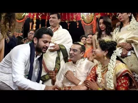 ఇక తాజాగా మ్యాంగో రామ్ కి అత్యంత సన్నిహితుడైన నితిన్ గతంలో సునీత – రామ్ ప్రీ వెడ్డింగ్ పార్టీకి హోస్ట్ గా చెయ్యడం చర్చనీయాంశం అయినట్టుగా ఇప్పుడు వీళ్ళ పెళ్ళిలో నితిన్ భార్య తో కలిసి పాల్గొనడం అంతే చర్చనీయాంశం అయ్యింది. హీరో నితిన్ – భార్య షాలిని లు కలిసి ఓ పబ్లిక్ ఫంక్షన్ లో పాల్గొనడం ఇదే మొదటిసారి. మూడు రోజుల క్రితమే తిరుమల తిరుపతికి వెళ్లి కాలినడకన శ్రీ వారి మెట్లు ఎక్కి మొక్కు తీర్చుకుని భార్య షాలిని పుట్టిన రోజు వేడుకలని ఘనంగా నిర్వహించిన నితిన్ మళ్ళీ సునీత పెళ్లి లో కనిపించడం ఫాన్స్ కి ఉత్సాహాన్ని ఇచ్చింది. మరి సునీత పెళ్లి వీడియో అలాగే ఫొటోస్ లో నితిన్ ఆయన భార్యనే మెయిన్ ఏట్రాక్షన్. ఇంకా ఈ పెళ్ళికి అనిత చౌదరి, సుమ కనకాల, ఆర్పీ పట్నాయక్, తెలంగాణ మంత్రి ముఖ్య అతిధులుగా పాల్గొన్నారు.