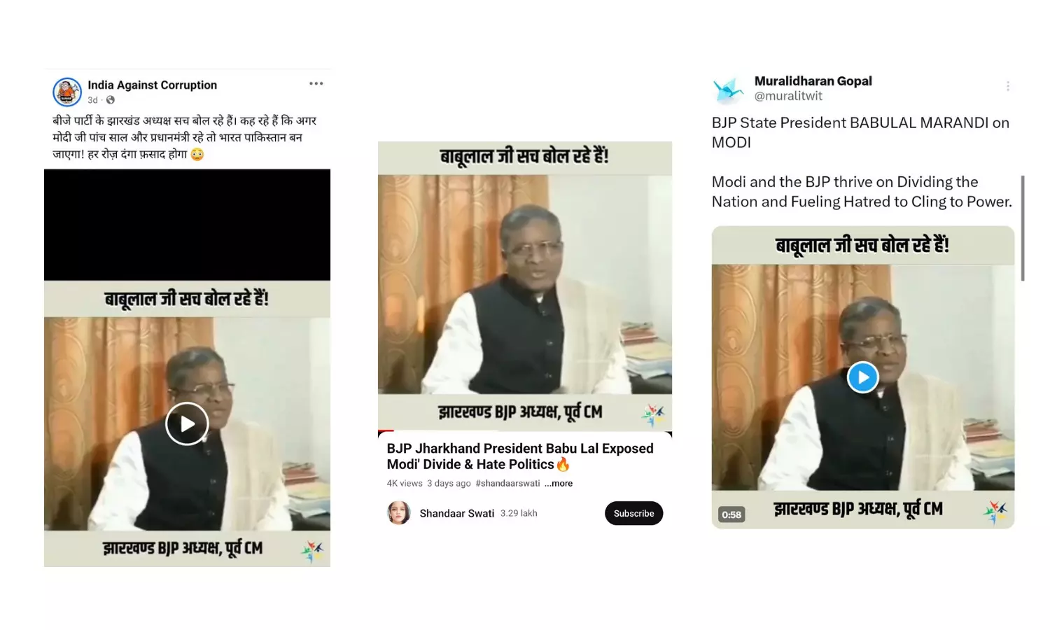 ଇତିମଧ୍ୟରେ ଏକ ଭିଡିଓ ସୋସିଆଲ ମିଡିଆରେ ଭାଇରାଲ ହେବାରେ ଲାଗିଛି । ଭିଡିଓରେ ଝାଡ଼ଖଣ୍ଡ ବିଜେପି ନେତା ବାବୁଲାଲ ମାରାଣ୍ଡି କିଛି କହୁଥିବା ବେଳେ, ଭିଡିଓ ଉପରେ ଲେଖା ହୋଇଛି ' ସତକହିଲେ ବାବୁଲାଲ, ଝାଡ଼ଖଣ୍ଡ ବିଜେପି ଅଧ୍ୟକ୍ଷ ଏବଂ ପୁର୍ବତନ ମୁଖ୍ୟମନ୍ତ୍ରୀ । ଭିଡିଓରେ ବାବୁଲାଲ ନରେନ୍ଦ୍ର ମୋଦିଙ୍କୁ କଟାକ୍ଷ କରି କହିଛନ୍ତି, ୨୦୧୪ ରେ ଦେଇଥିବା ପ୍ରତିଶ୍ରୁତିକୁ ପୁରଣ କରିନାହାନ୍ତି ମୋଦି । ଏବେ କେବଳ ସାମ୍ପ୍ରଦାୟିକ ଅଘଟଣ ଘଟାଉଛନ୍ତି, ହିନ୍ଦୁ ମୁସଲମାନ ନାଁରେ ତ କେତେବେଳେ ମନ୍ଦିର ଏବଂ ମସଜିଦ ନାଁରେ ତ କେତେବେଳେ ଗାଈ ନାଁରେ । ସେହିପରି କେତେବେଳେ ଧର୍ମାନ୍ତିକରଣ ଏବଂ ଲଭ୍ ଯିହାଦ ନାଁରେ । ଭାଇ ଏହି କାମ ପାଇଁ ଜନତା ସରକାରରେ ତୁମକୁ ବସାଇ ନାହାନ୍ତି, ଏଭଳି ବ୍ୟକ୍ତିଙ୍କୁ କିଏ ଭୋଟ ଦେବ ଯିଏ ଦେବ ସେହି ବ୍ୟକ୍ତି ସବୁଠାରୁ ଖରାପ ହୋଇଥିବ ।