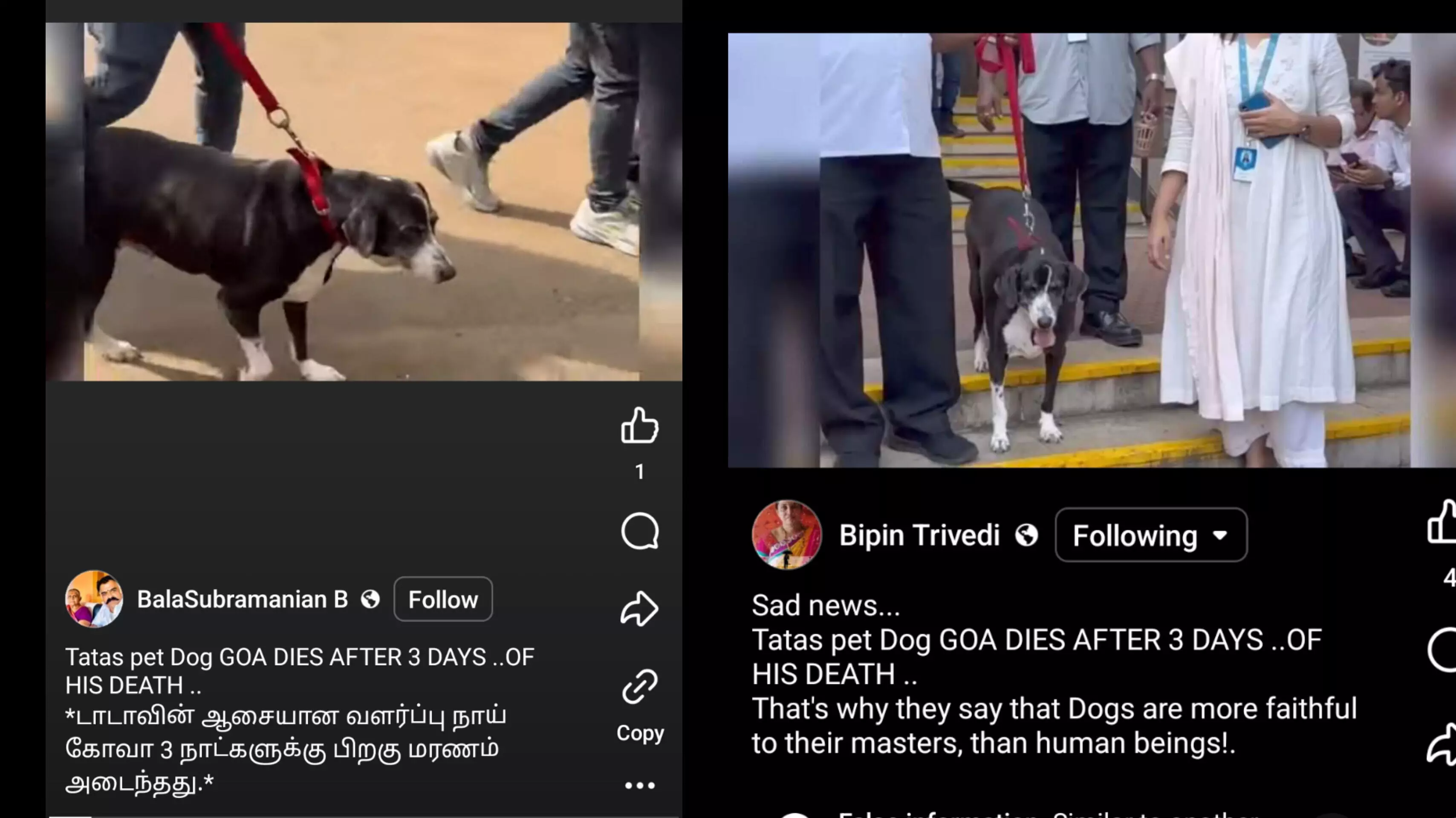 ତେବେ ସୋସିଆଲ ମିଡିଆରେ ୟୁଜର୍ସ ଏକ କ୍ୟାପସନ ସହ କୁକୁରଟିର ଭିଡ଼ିଓ ସେୟାର କରିଥିଵାର ଦେଖା ଦେଇଛି । କ୍ୟାପସନରେ ଉଲ୍ଲେଖ ରହିଛି, Sad news... Tatas pet Dog GOA DIES AFTER 3 DAYS ..OF HIS DEATH .. That's why they say that Dogs are more faithful to their masters, than human beings!.